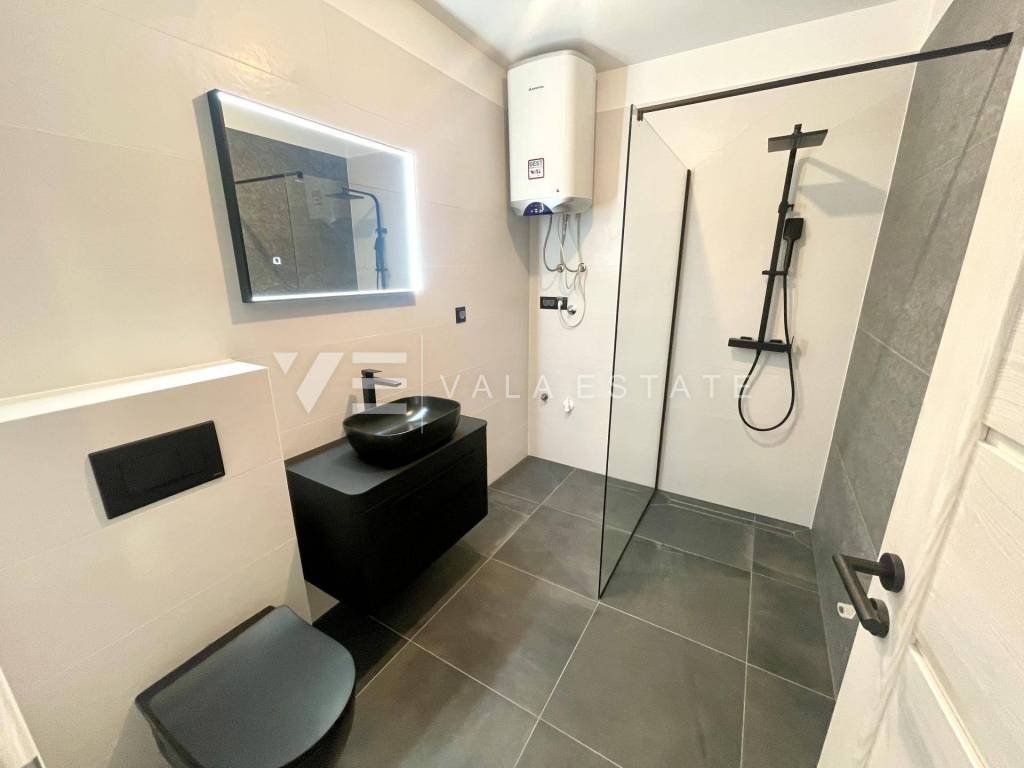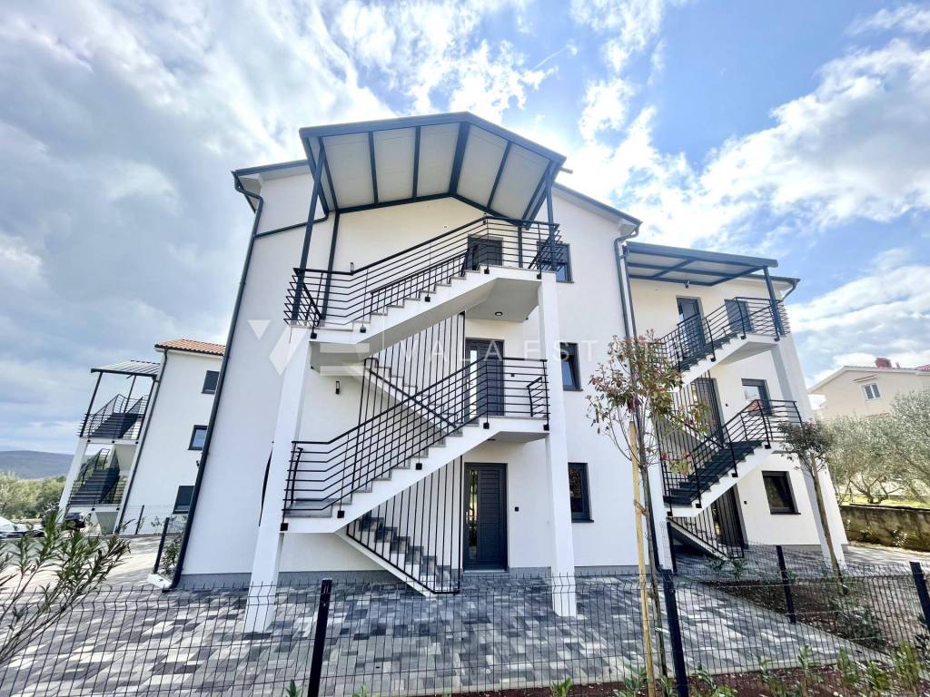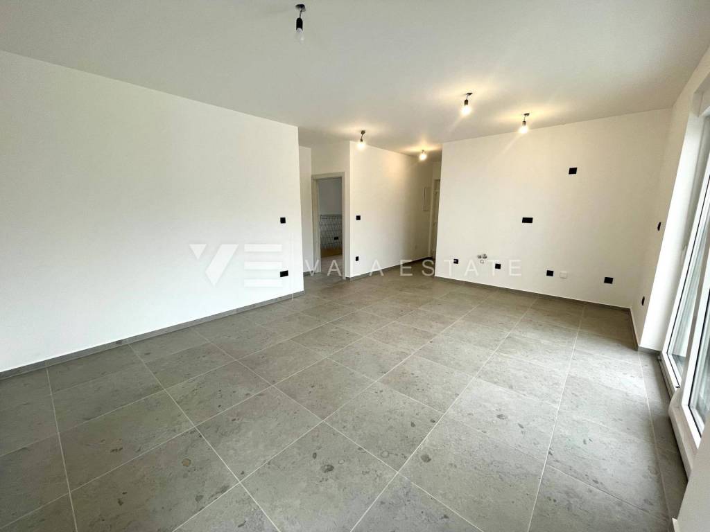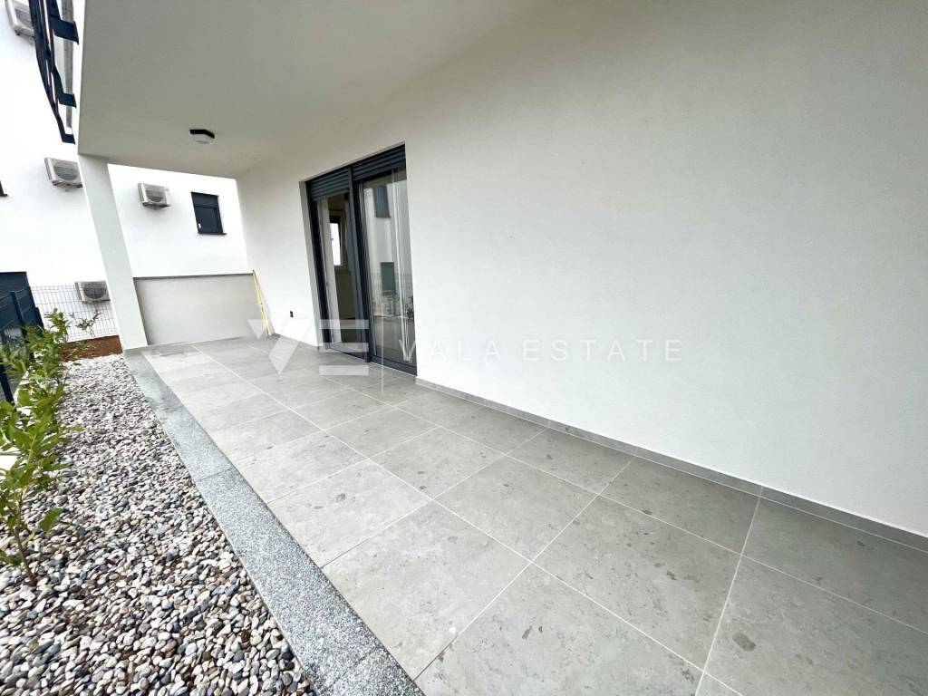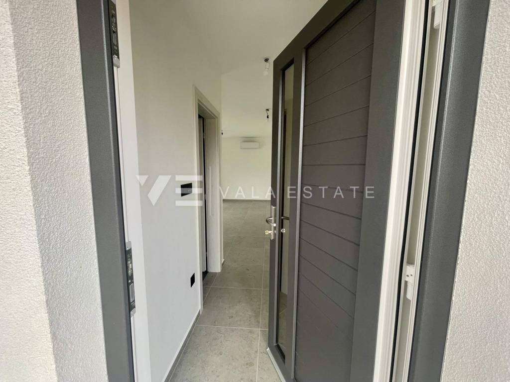 Real estate Island of Krk, Soline bay - for sale is an apartment on the ground floor of a new building consisting of a total of six residential units. The apartment has a living area of 63 m2 and consists of an entrance hall, two bedrooms, bathroom, kitchen, dining room and living room with access to a covered terrace and a garden of 30 m2. It has one parking space in the common courtyard of the building. Quality materials and equipment were used for construction, including ceramic floor coverings, quality sanitary ware, electric underfloor heating in the bathroom, air conditioning, high-quality aluminum and PVC joinery and security doors. It is located in a prime location near the sea, beautiful beaches and the center with all necessary amenities. The property is currently under construction, and the planned completion is expected by the end of 2025.