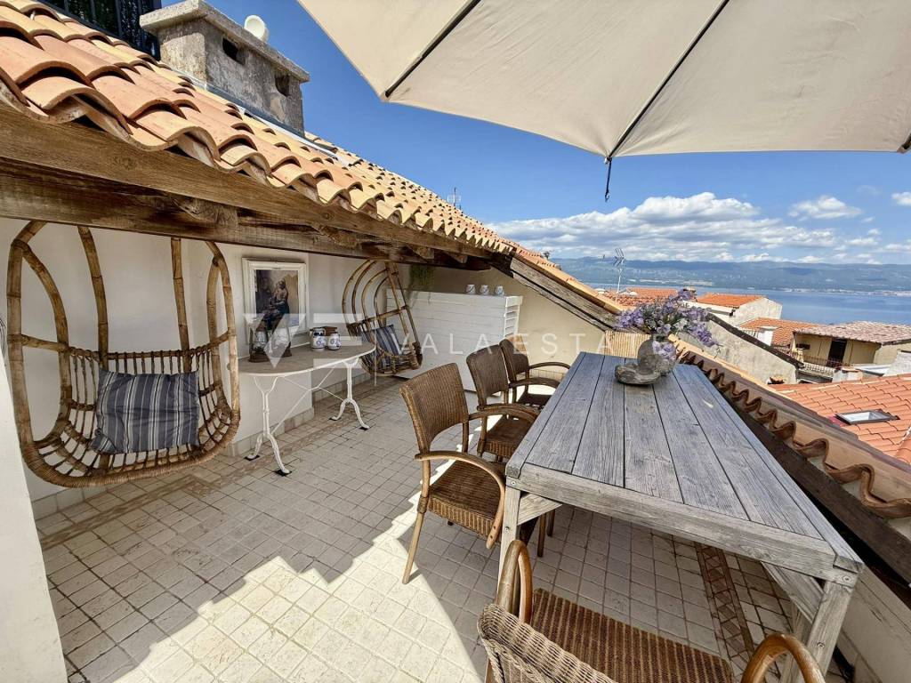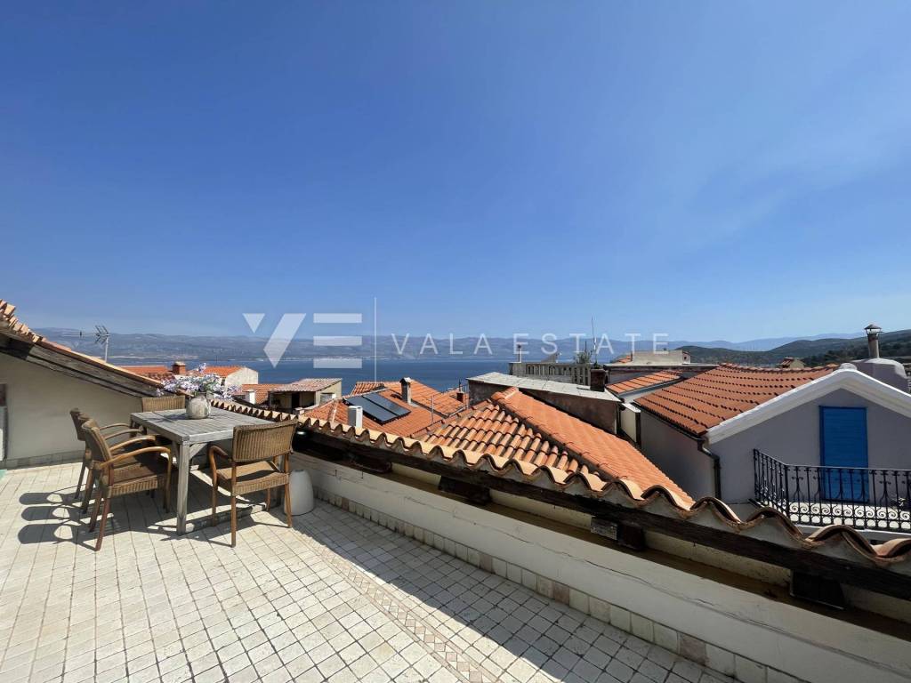 Real estate island Krk, Vrbnik - for sale is a quality renovated and tastefully furnished authentic stone terraced house located in the old town center of Vrbnik. It consists of two apartments with a total living area of 120 m2. On the ground floor there is a studio apartment with a small kitchen, bathroom and bedroom. On the first floor, which is connected by external stairs, there is a second apartment spread over three floors connected by an internal staircase. On the first floor there is an entrance hall, bedroom and bathroom, the second includes a kitchen with a dining area and living room, and on the third there is a large roof terrace with a panoramic view of the sea. The house is furnished in a rustic note in the interior and exterior. During the renovation, quality materials were used and indigenous elements and stone were retained, it is air-conditioned and has a fireplace. Ideal for investment for the purpose of tourist rental, but also for all lovers of coastal architecture.