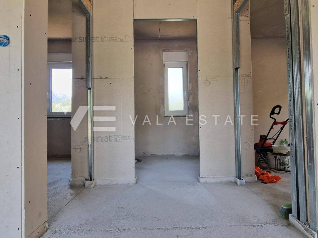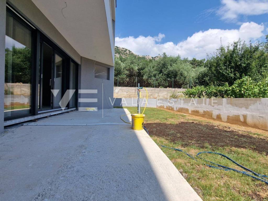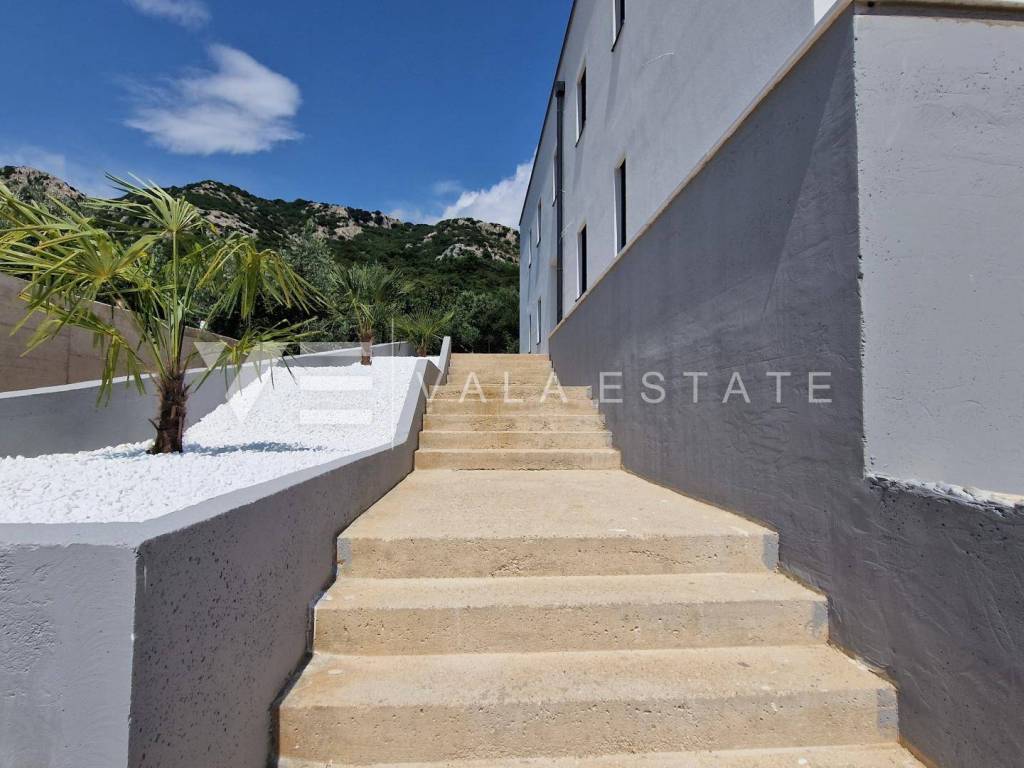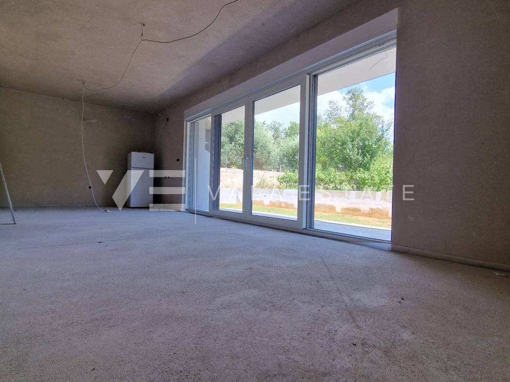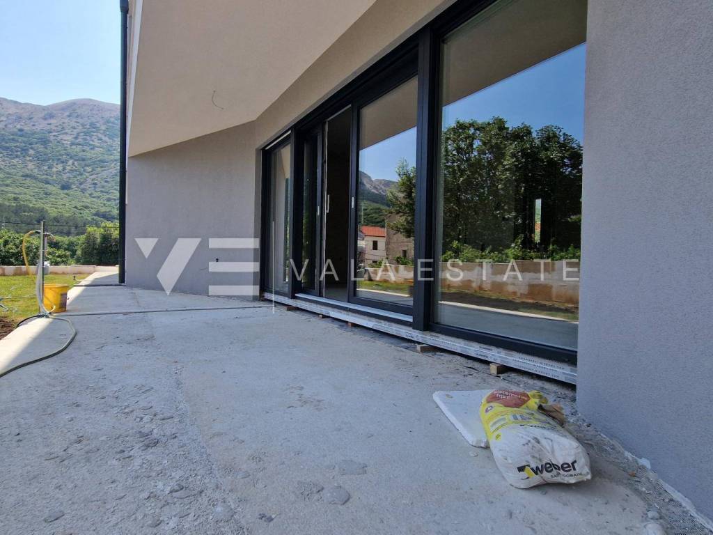 Real estate Island of Krk, Baška surroundings - for sale is an apartment on the ground floor of a new building consisting of a total of four residential units. The apartment has a living area of 62 m2 and consists of an entrance hall, two bedrooms, bathroom, kitchen, dining room and living room with access to a covered terrace and garden of 140 m2. It has two parking spaces in the common courtyard of the building. Quality materials and equipment are used for construction, including ceramic floor coverings, quality sanitary facilities, room air conditioning, built-in high-quality PVC carpentry with electric blinds and burglar-proof doors. It is located in a quiet location 4000 m from the sea, beautiful beaches and the center with all necessary facilities. The property is currently under construction, and the planned completion is expected in August 2024.