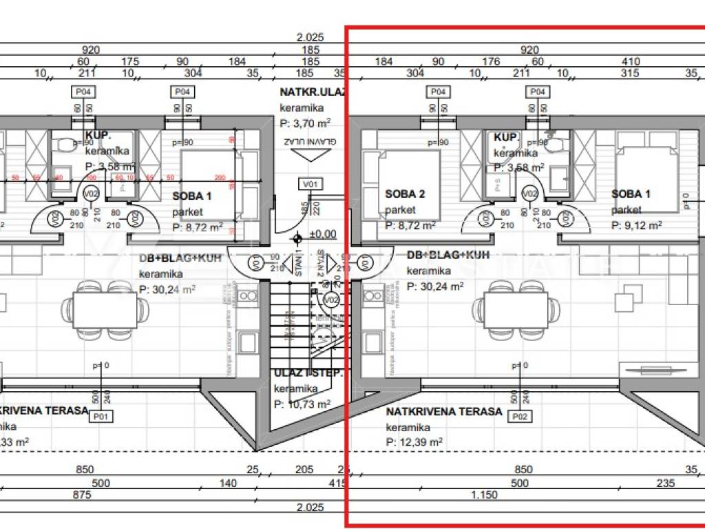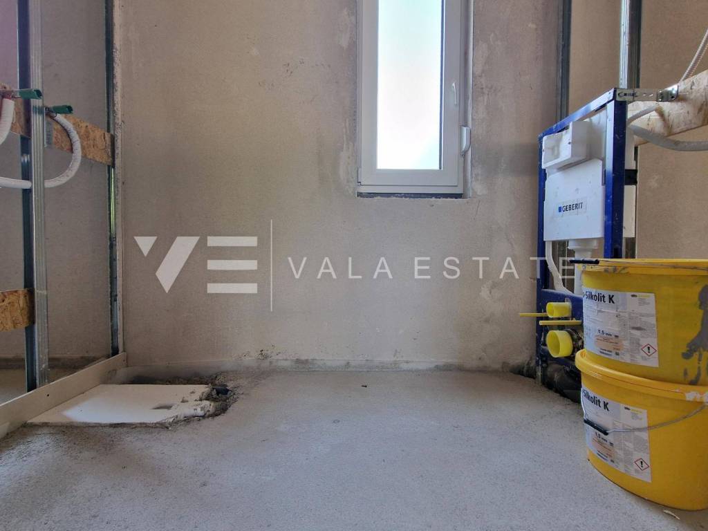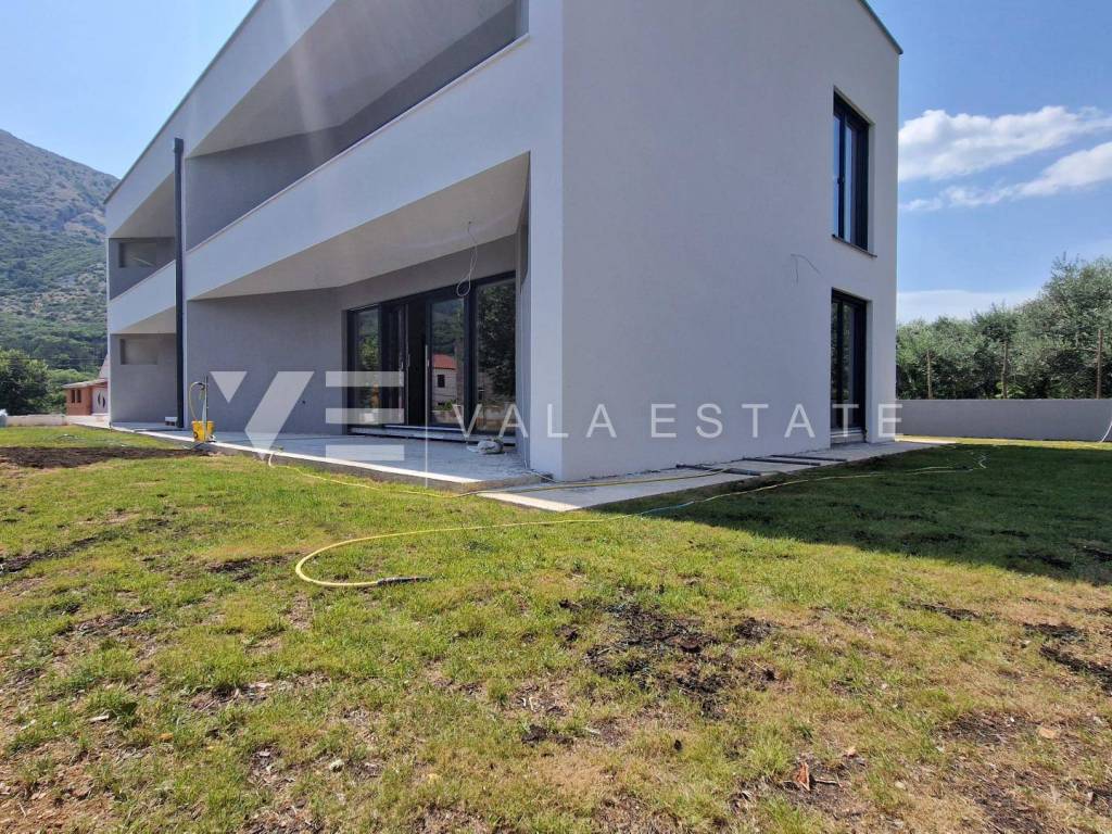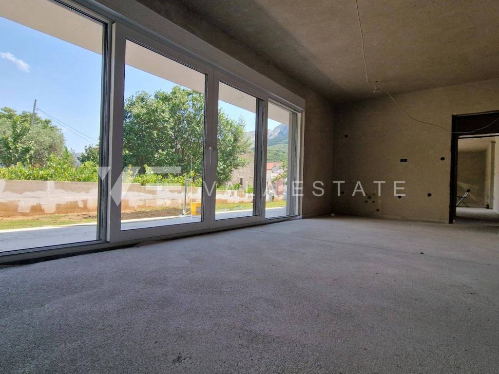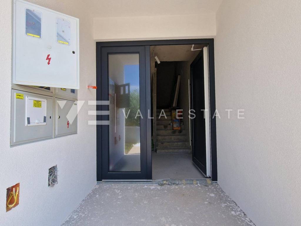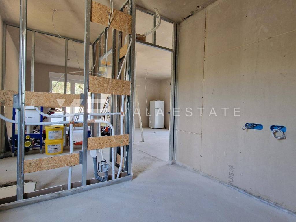 Real estate Island of Krk, Baška surroundings - for sale is an apartment on the ground floor of a new building consisting of a total of four residential units. The apartment has a living area of 62 m2 and consists of an entrance hall, two bedrooms, bathroom, kitchen, dining room and living room with access to a covered terrace and garden of 140 m2. It has two parking spaces in the common courtyard of the building. Quality materials and equipment are used for construction, including ceramic floor coverings, quality sanitary facilities, room air conditioning, built-in high-quality PVC carpentry with electric blinds and burglar-proof doors. It is located in a quiet location 4000 m from the sea, beautiful beaches and the center with all necessary facilities. The property is currently under construction, and the planned completion is expected in August 2024.