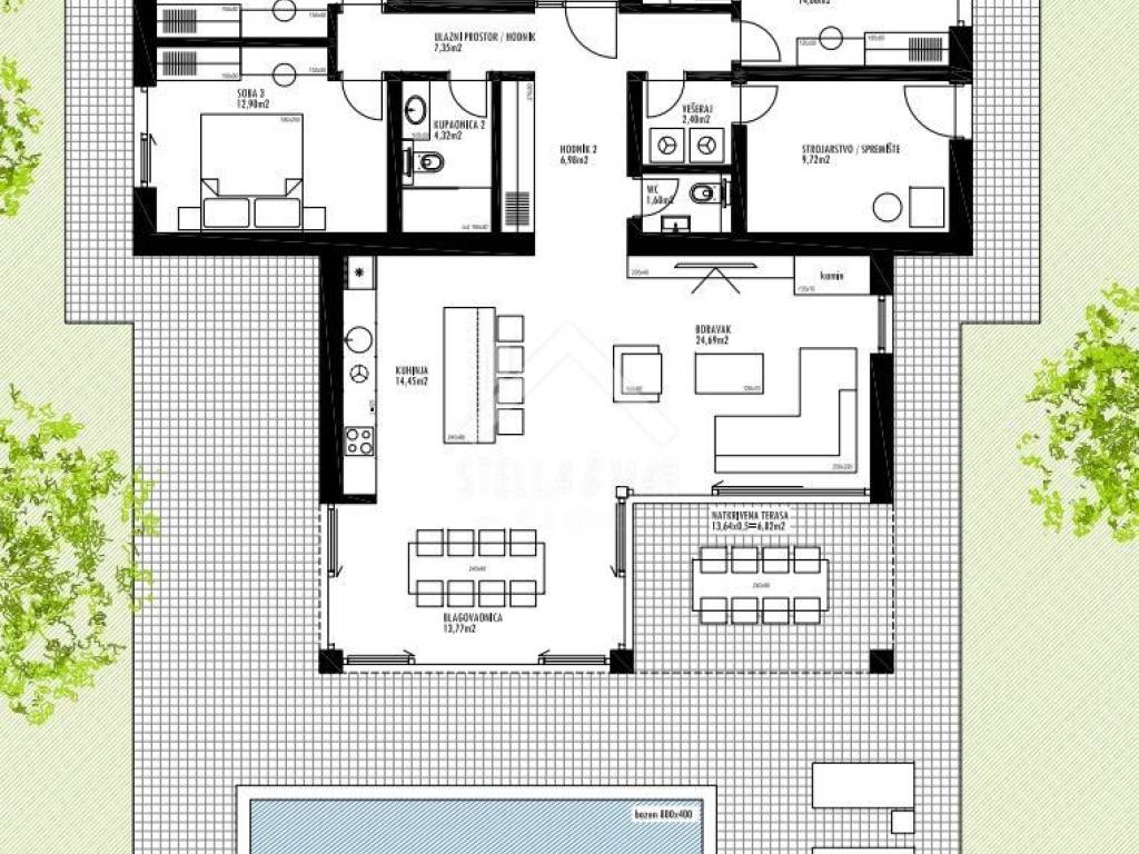 Prema idejnom projektu prizemnica ima cca 115m2 bruto površine te se sastoji od prostranog dnevnog boravka sa kuhinjom, blagovaonom, tri spavaće sobe, dvije kupaone, strojarnice, vešeraja i spremišta. U dvorištu je bazen .