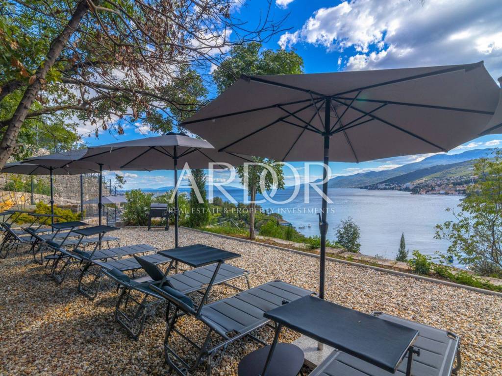 Opatija Riviera, in a unique location, first row to the sea, this luxury resort is situated on a plot of 1449 m with beautiful scenery, terraced gardens and a 50 m swimming pool, offering stunning, uninterrupted views of the Opatija Riviera.