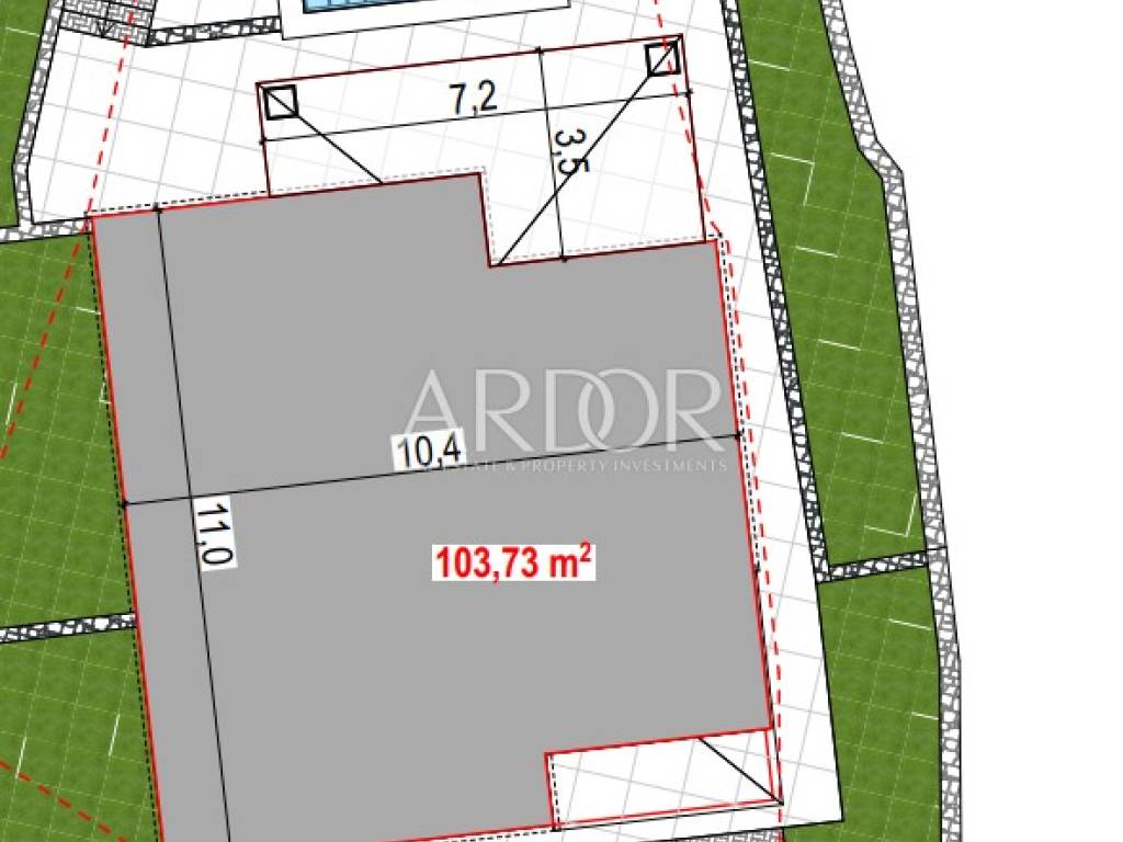 Planirana kuća na zemljištu će imati vlastiti privatni bazen, vanjsku natkrivenu terasu, vrt, parkirališta i podrum. U prizemlju, koje će biti površine 104,62 m2, biti će smješteni: prostrana kuhinja, dnevni boravak i jedna spavaća soba s kupaonicom, dok će na katu, površine 70,30 m2, biti tri sobe i dvije kupaonice.