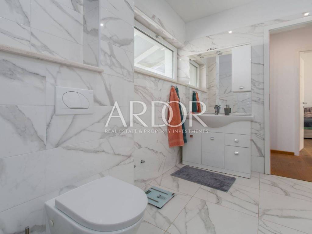 Internal stairs lead to the first floor where there is one master bedroom with a bathroom and a separate corridor for greater intimacy, from which you can access the terrace with a view of the sea, and the second bedroom, which also has its own bathroom with toilet. The first floor also leads to another, spacious terrace with a panoramic view.