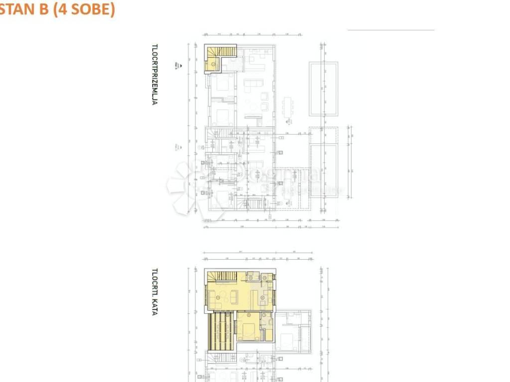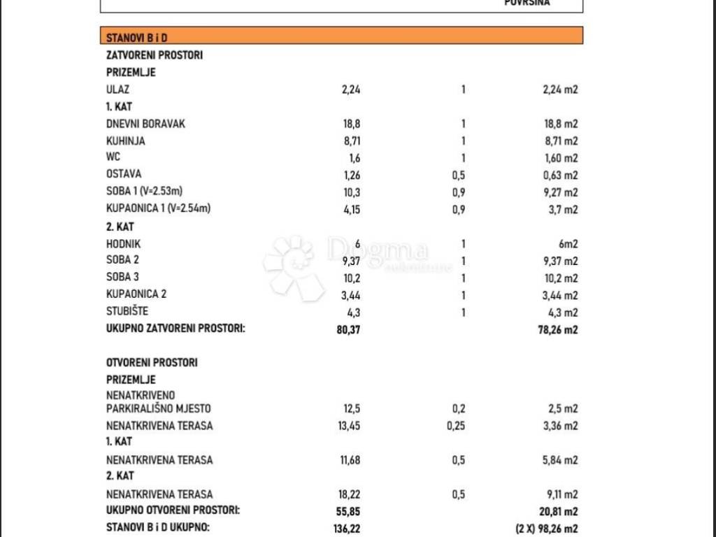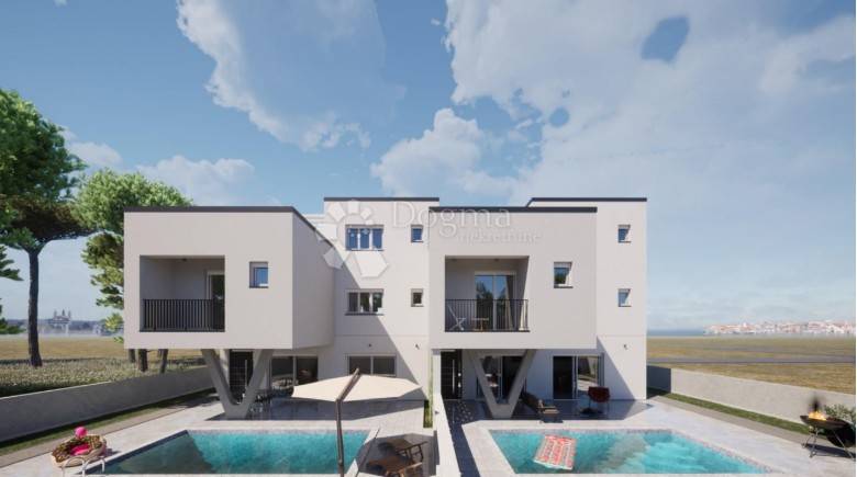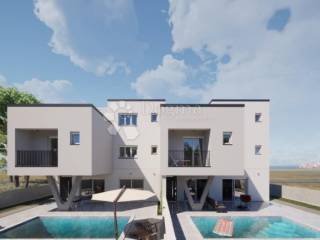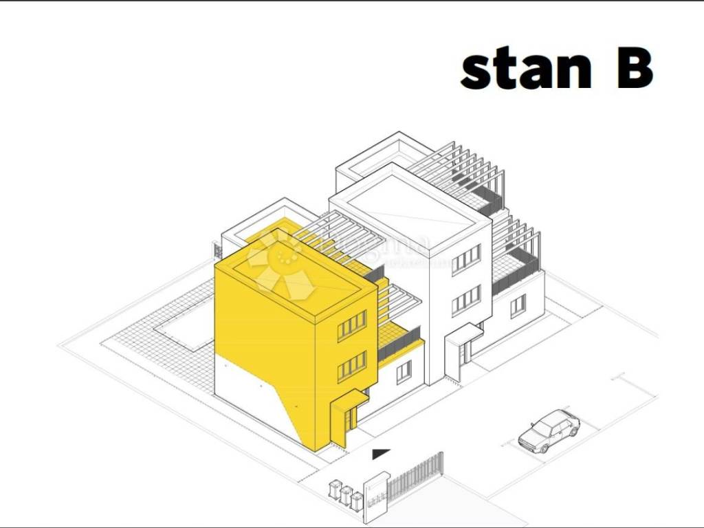In Vrsi, a quiet coastal village near Zadar, a modern two-story apartment B is for sale in a new, high-quality building, just 300 meters from the sea. The apartment is spread over two floors, with a total net area of 98.26 m. The lower floor consists of a spacious living room with a kitchen and dining room, a pantry, a toilet and one bedroom, while the upper floor has two bedrooms, two bathrooms and a hallway. The apartment has three terraces that allow you to enjoy the sun and the view of the surroundings throughout the day. The building was built according to the highest energy efficiency standards - A+ class, with aluminum joinery and triple-layer insulated glass and a heat pump for heating and cooling. Top-notch insulation and a modern air conditioning system guarantee low utility costs and a pleasant stay throughout the year. Located in a quiet part of Vrsi, the project combines contemporary architecture, functionality and proximity to the sea. Apartment B is an ideal choice for family life, seasonal vacation or investment in tourist rental.