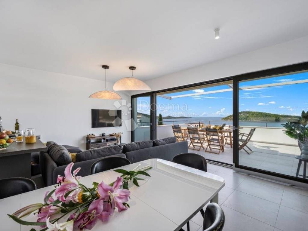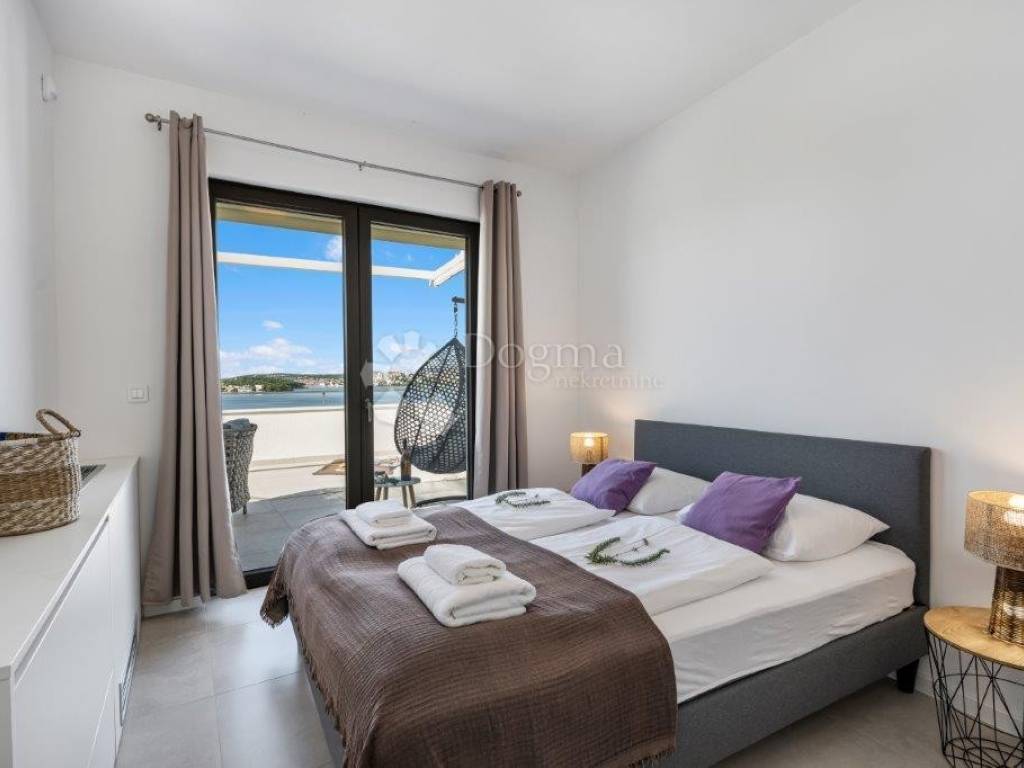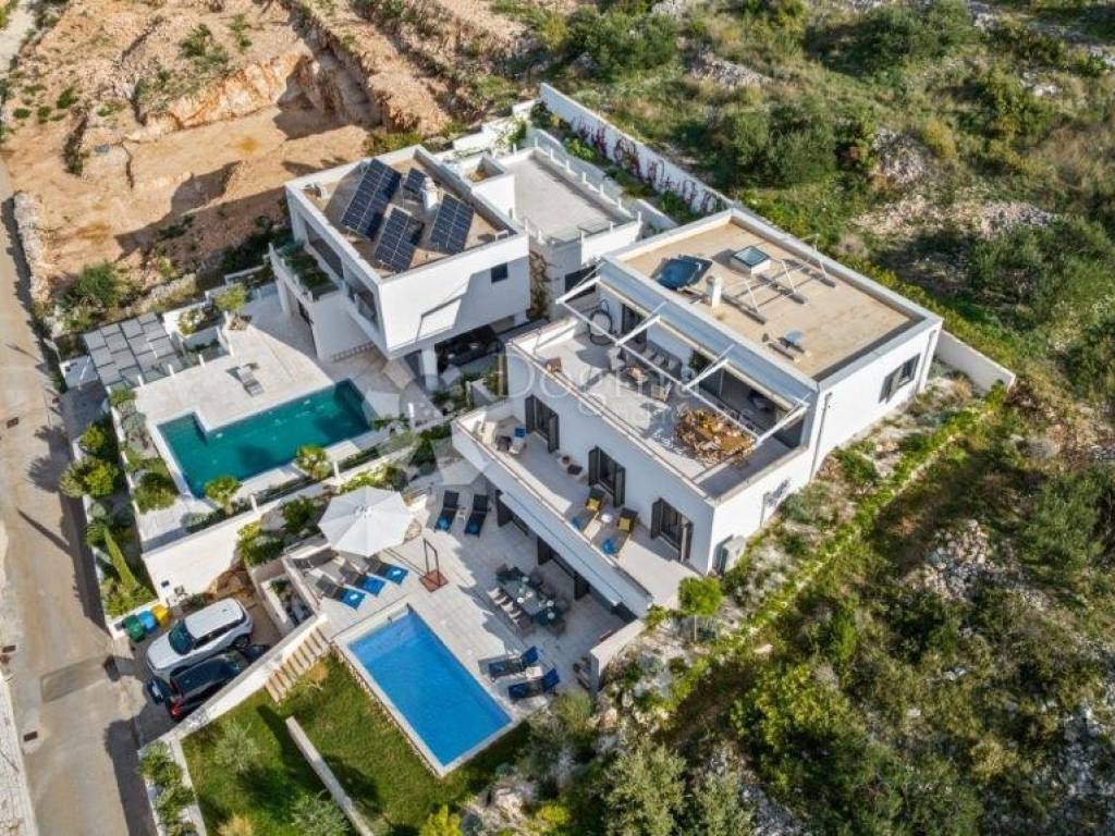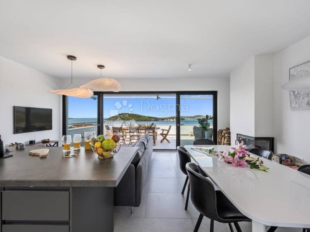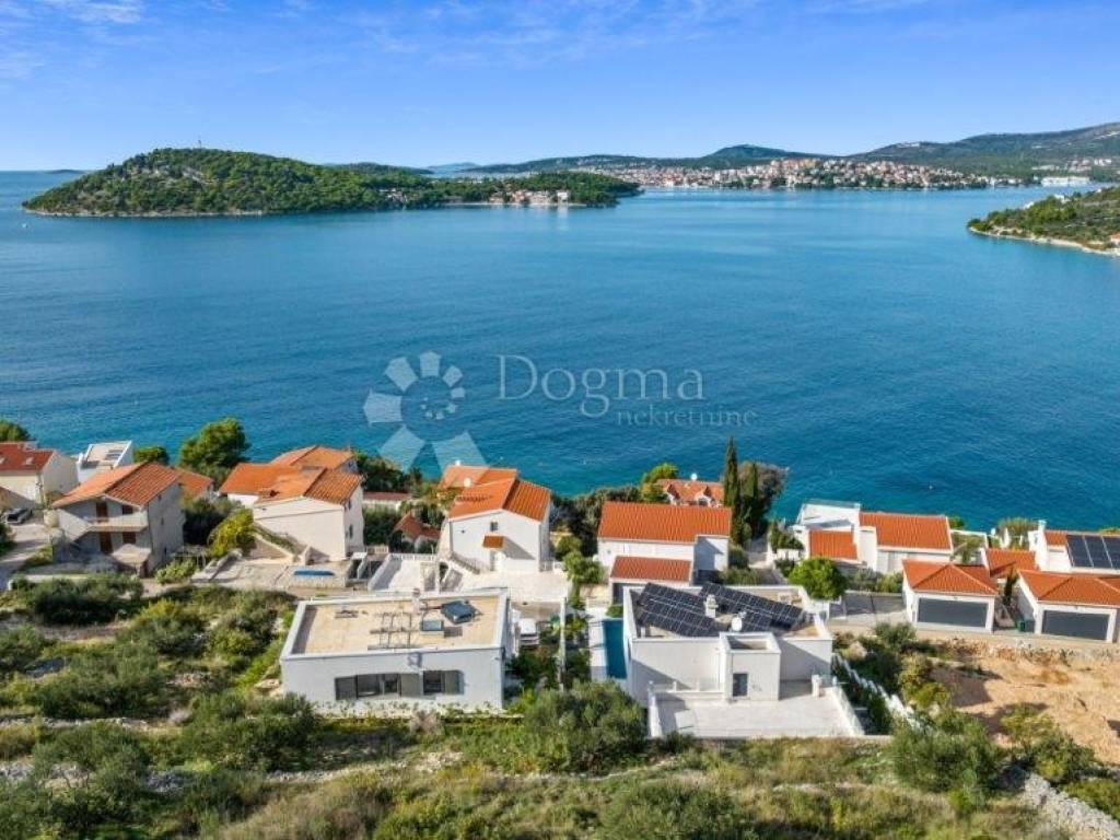 For sale is a luxurious, modernly decorated villa located in the immediate vicinity of Rogoznica, only 110m from the sea. The property extends over three floors, with a total living area of approximately 186 m, and with its layout, quality equipment and attractive location, it provides superior comfort and an ideal combination of Mediterranean lifestyle and modern comfort. The villa is suitable for family life, vacation or as an excellent investment for tourist rental. The ground floor includes a spacious entrance area that leads to a modernly equipped sauna with shower, a fully equipped kitchen with dining area and access to a stone-paved terrace. The outdoor area features a private swimming pool with shower, a landscaped garden and a built-in barbecue, creating the perfect place to enjoy the outdoors. There is also an additional storage room on this floor. The first floor consists of three comfortable bedrooms. The master bedroom has its own bathroom, while the other two share an additional bathroom. All rooms have access to a spacious terrace with a beautiful view of the sea and the surrounding area. The second floor offers an elegantly decorated kitchen with an island, a dining room and a bright living room with large glass walls that provide plenty of natural light. The living room opens onto a spacious terrace with panoramic views of the sea, nearby islands and Rogoznica. There is also an additional bedroom with its own terrace and another bathroom on this floor. The villa is west-facing, which allows for beautiful sunsets and sunlight throughout the day. It is equipped with a water-based underfloor heating system and air conditioning in all rooms, and only high-quality materials and carefully selected furniture have been used. This property represents the perfect combination of luxury, functionality and a unique location - an ideal opportunity for anyone looking for an exclusive home by the sea.