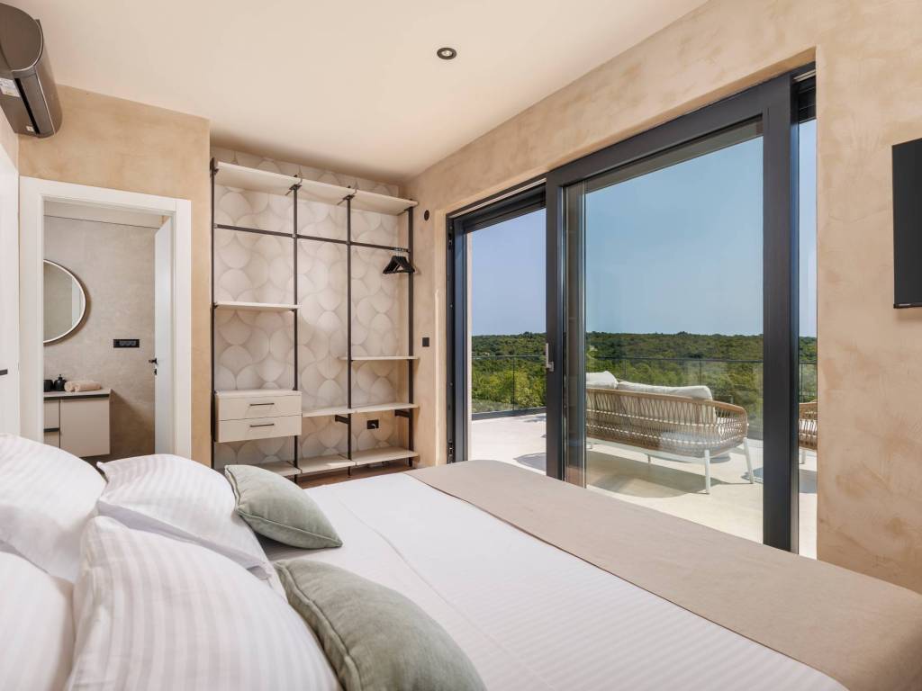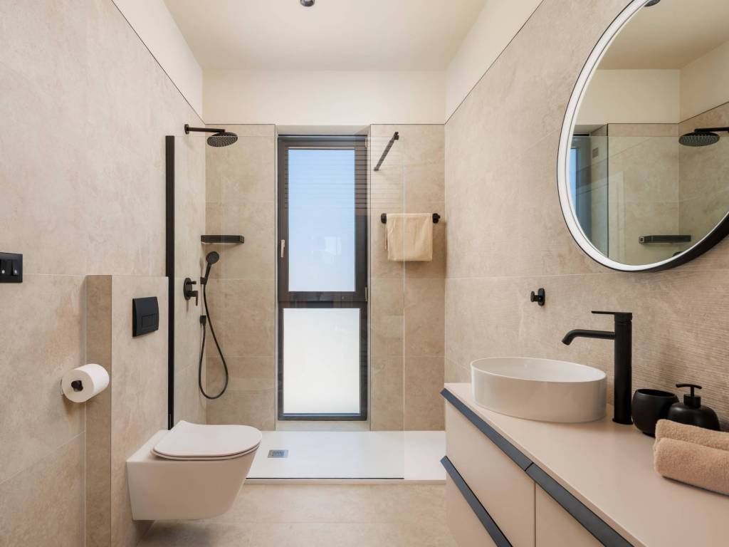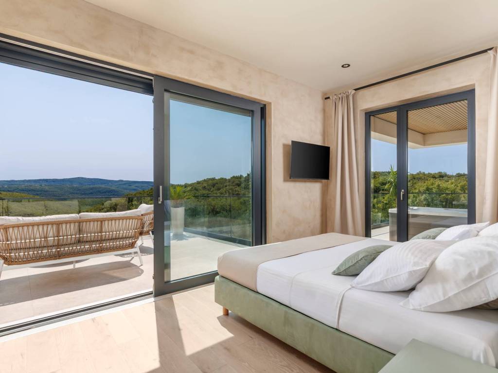 The stairs will lead to the upper floor where there will be a bedroom with access to an uncovered terrace of 18 m2 with a view of the surrounding hills and olive groves. On the other side, this room has access to another covered terrace with a hydro-massage tub, with a panoramic view. The bedroom also has an en-suite bathroom that is equipped with a sauna with a view of the surrounding nature.