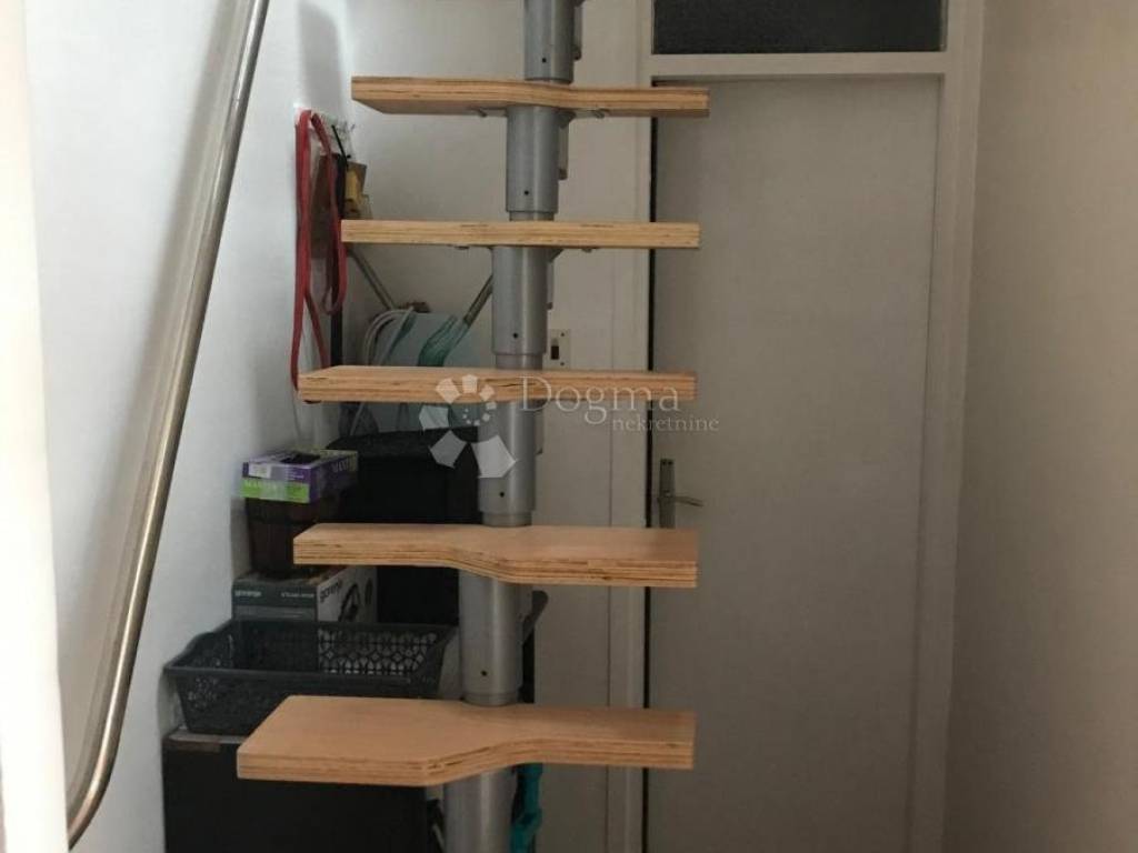 The apartment is located on the 4th floor of a building without an elevator. It consists of a kitchen with living room and a bathroom. An internal staircase leads to the upper floor a high attic where two bedrooms are located. The apartment includes an 8 square meter terrace accessible from the living room, as well as a 4 square meter storage room.