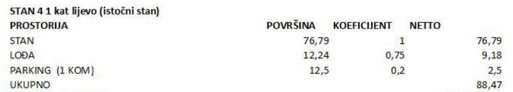 Apartment S4 is located on the first floor and consists of an entrance hall, kitchen, dining and living area, two bedrooms, and two bathrooms, with a total interior surface of 76,79 m. The apartment also includes a covered terrace of 12,24 m and one parking space.