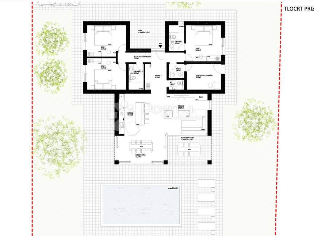 Površina zemljišta iznosi 930 m, a ishođena je građevinska dozvola za izgradnju prizemnice s bazenom. Prema idejnom projektu, kuća ima približno 115 m bruto površine i sastoji se od prostranog dnevnog boravka s kuhinjom i blagovaonicom, tri spavaće sobe, dvije kupaonice, strojarnice, vešeraja i spremišta. U dvorištu je planiran bazen.
