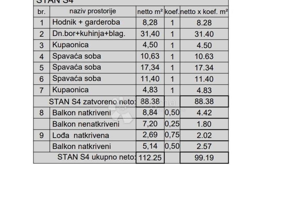The new residential building consists of six buildings in a row, each with four apartments. The apartments on the ground floor have their own courtyard. Each apartment has a parking space, and there is also the option of purchasing a storage room. The apartments are equipped with underfloor heating, electric roller shutters, ceramic and laminate floors, sanitary appliances and air conditioning. BUILDING 3 APARTMENT S4: - 2ND FLOOR - Total area: 99.19 m2 - Three bedrooms - 2 bathrooms - balcony and loggia - Living room, kitchen and dining room - Underfloor heating - PVC - triple-glazed glass - El. roller shutters NOTE: parking spaces and storage rooms are charged additionally. Possibility of purchasing a garage parking space. Expected completion planned for next year - 2026! 1/1 OWNERSHIP! For all questions or necessary information, please contact us at: Gabrijela Lovrinović Brokerage Assistant Mob: 097 7617 229 Email: gabrijela.lovrinovic@dogma-nekretnine.com Filip Crnjac Licensed Agent Mob: 091 6001 216