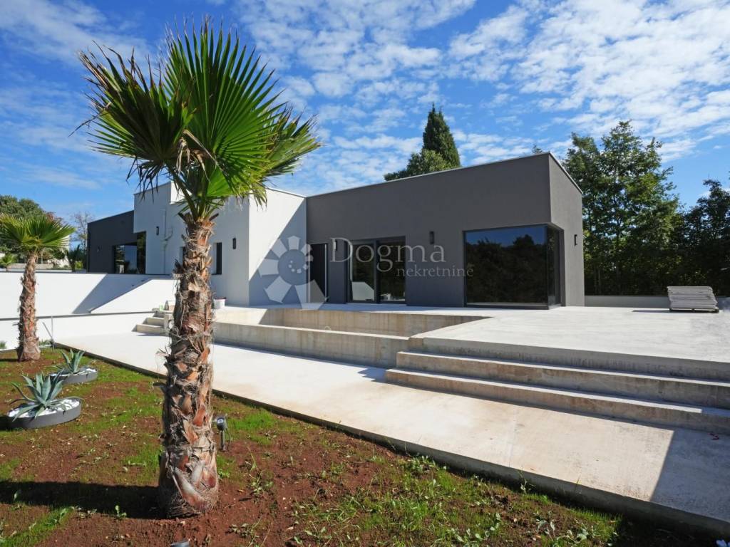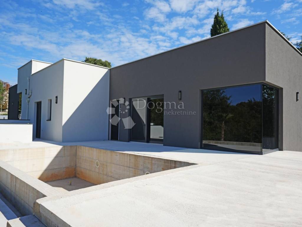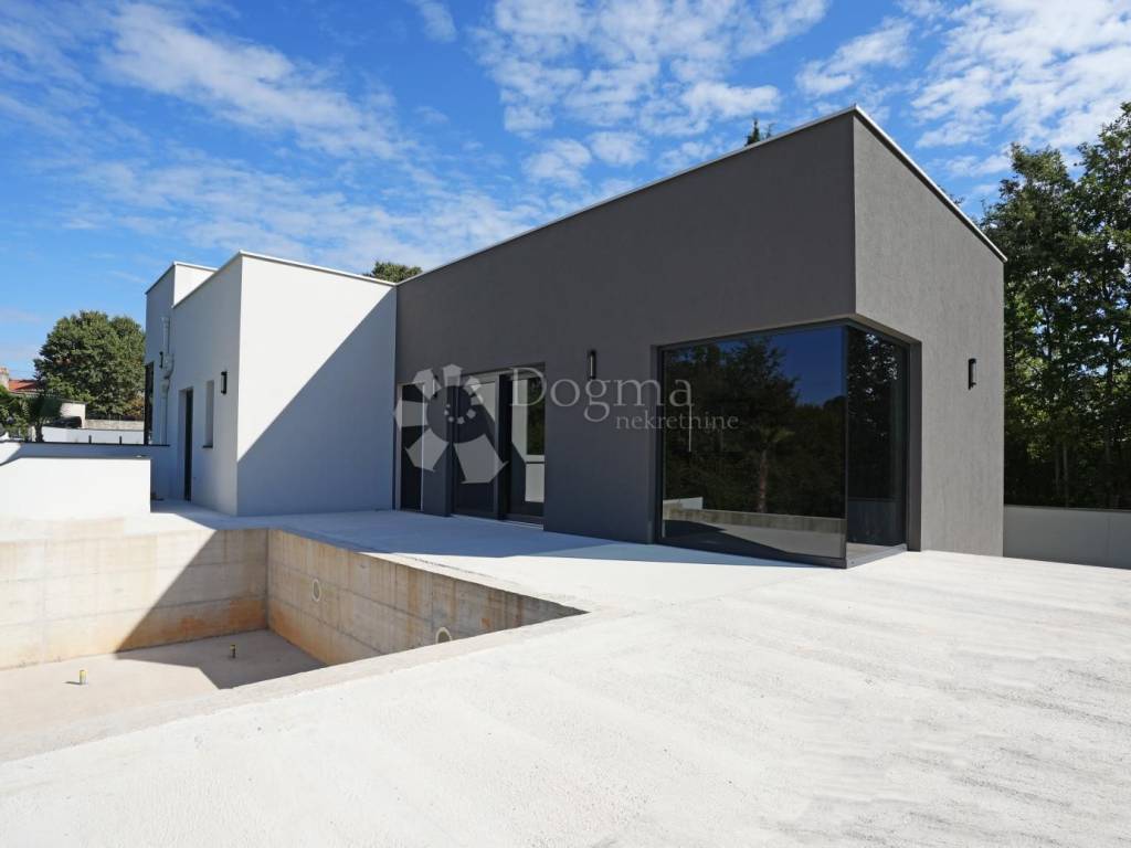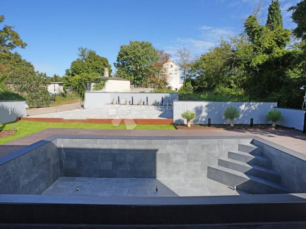 The interior is designed in an open space style, where the kitchen, dining area, and living room merge into a spacious, bright, and functional area. A large glass wall in the living room allows plenty of natural light and opens onto the outdoor terrace, offering a view of the private heated pool, perfect for year-round relaxation.