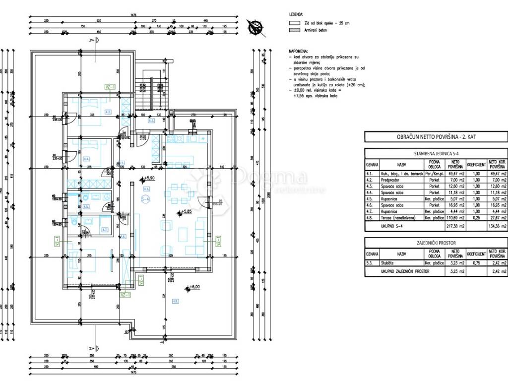 Apartment S4 is situated on the second floor and covers a total area of 147.49 m. The living area of 134.36 m consists of three bedrooms, one of which has its own bathroom, an additional two separate bathrooms, a hallway, and a spacious kitchen with a dining area and a living room that has access to an uncovered terrace of 110.69 m.