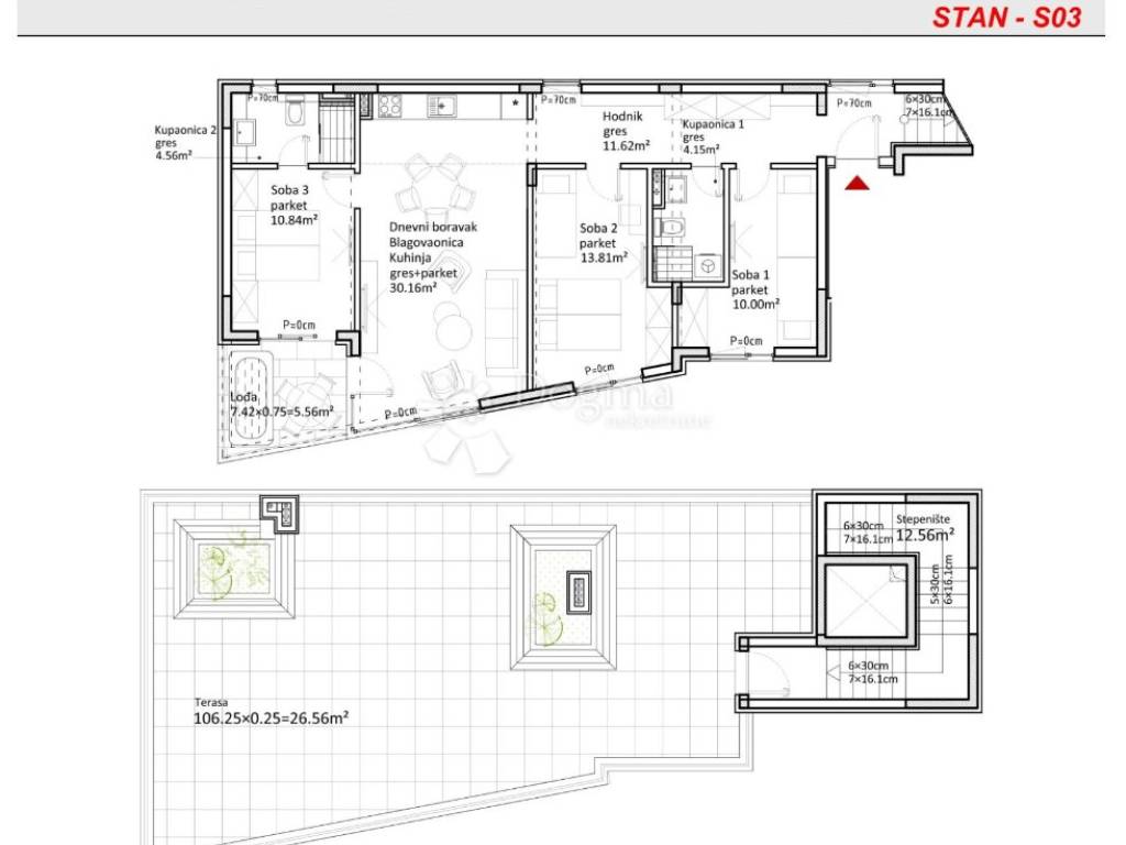 We proudly present to you an apartment on the second floor, facing south, which covers 132.32 m of net area. The apartment includes a living room connected to the kitchen, two modern bathrooms, a hallway, three bedrooms, a loggia, and a roof terrace (106.25 m2).