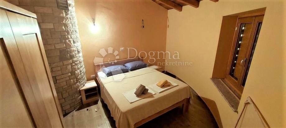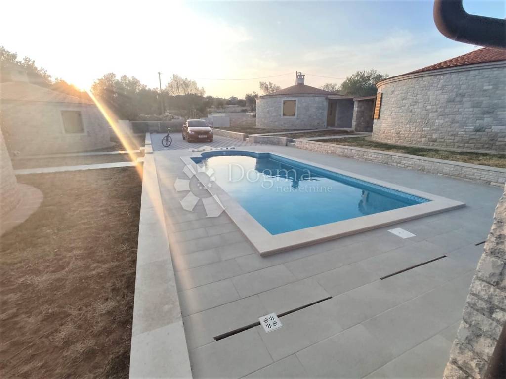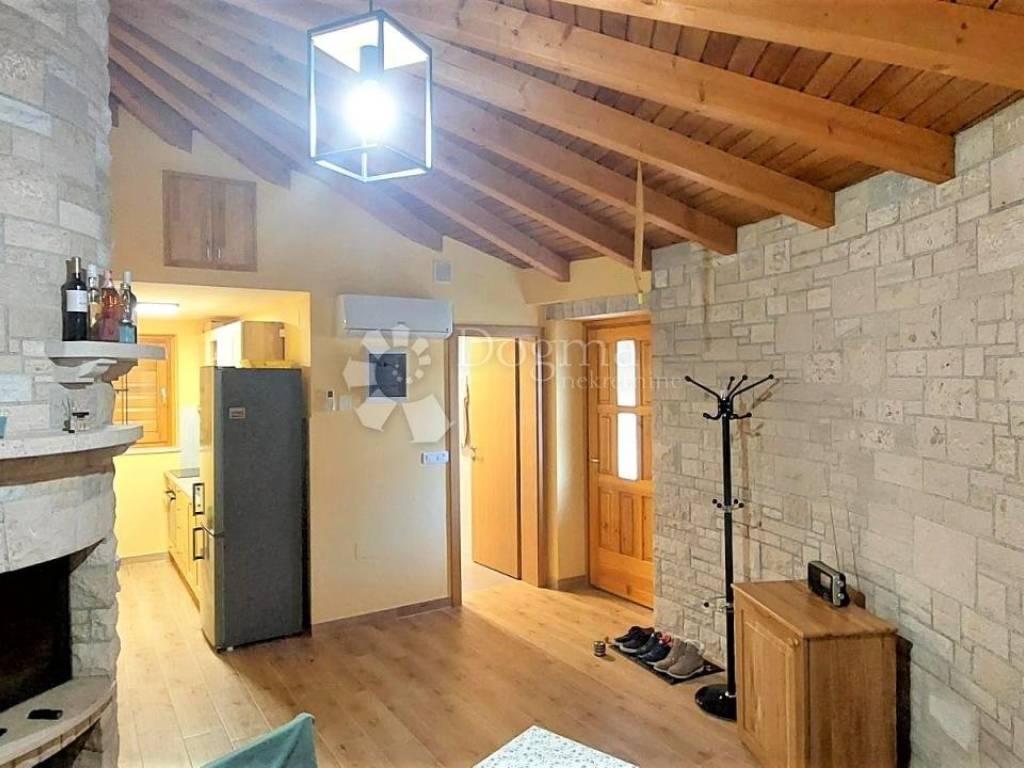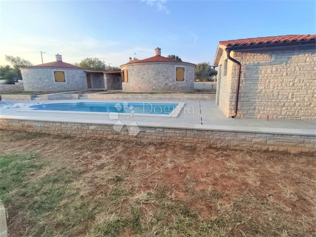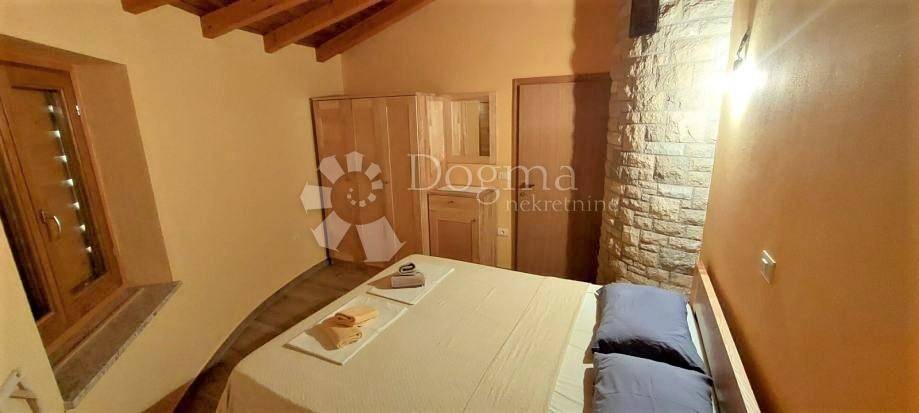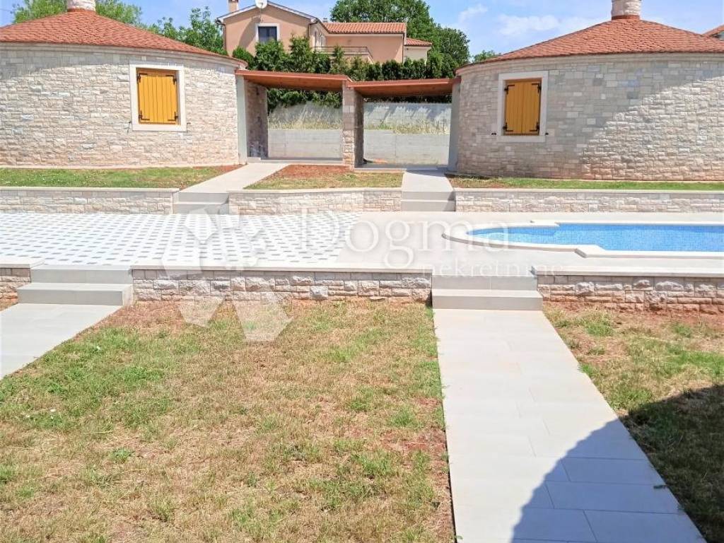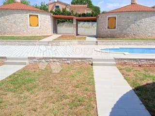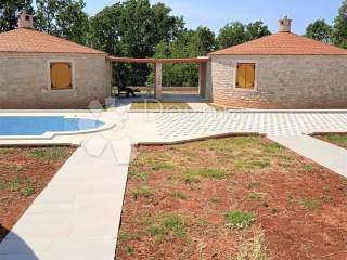 Four luxurious and unique one-story houses in the form of autochthonous Istrian kažuns are located in one settlement near Krnica, each of which has an area of 55 m2. Each modern-rustic kažun has a separate yard and a covered terrace of 14 m2, and consists of an entrance hall, kitchen, spacious living room, bathroom and bedroom. Between these four single-story buildings is a pool of 26 m2, for shared use, with a sunbathing area and a storage room. The plot is surrounded by a high-quality industrial fence, and the entrance door is electrically operated, with a code and an intercom. The houses are built with natural materials - stone, which is precisely what attracts attention and gives the atmosphere of Istrian flair. The houses are equipped with outdoor and indoor air conditioning units, and in the spacious living room there is a fireplace that completes the atmosphere of the stay in the winter months.