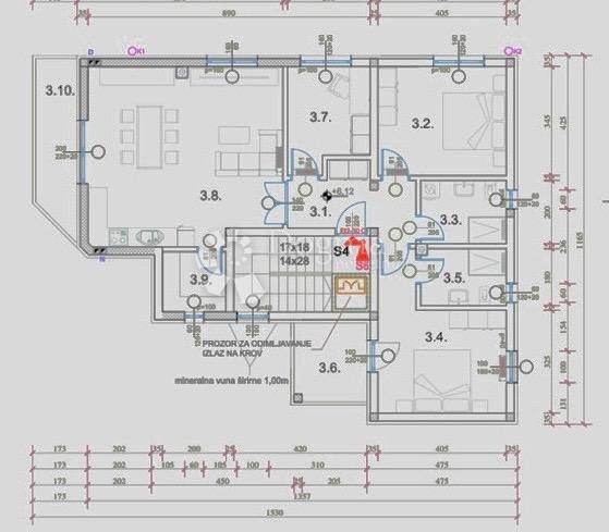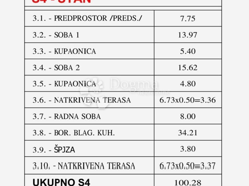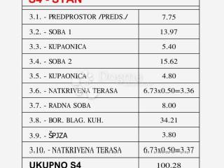 PULA - VALDEBEK - S4 An excellent apartment for sale in Valdebek with a total area of 100.28 m2. The apartment consists of 3 bedrooms (one of which is slightly smaller and can also be used as a study), 2 bathrooms, 2 covered terraces, living room, dining room and kitchen, pantry and hallway. Room 1 - 13.97 m2 Room 2 - 15.62 m2 Room 3 (study) - 8.00 m2 Bathroom 1 - 5.40 m2 Bathroom 2 - 4.80 m2 Living room, dining room and kitchen - 34.21 m2 Terrace 1 - 6.73 m2 Terrace 2 - 6.73 m2 Pantry - 3.80 m2 This excellently designed apartment uses air conditioning inverters for heating, underfloor heating in the bathrooms, and has a chimney in the living area where a solid fuel stove can be connected. * NEW CONSTRUCTION 2023 * 2 FLOOR * 3 BEDROOMS (one of which is smaller, so it can also be a study - 8m2) * 2 BATHROOMS * 2 TERRACES * INVERTER AIR CONDITIONING and UNDERFLOOR HEATING IN THE BATHROOM * CHIMNEY * 2 PARKING SPACES 2 parking spaces are included in the price.