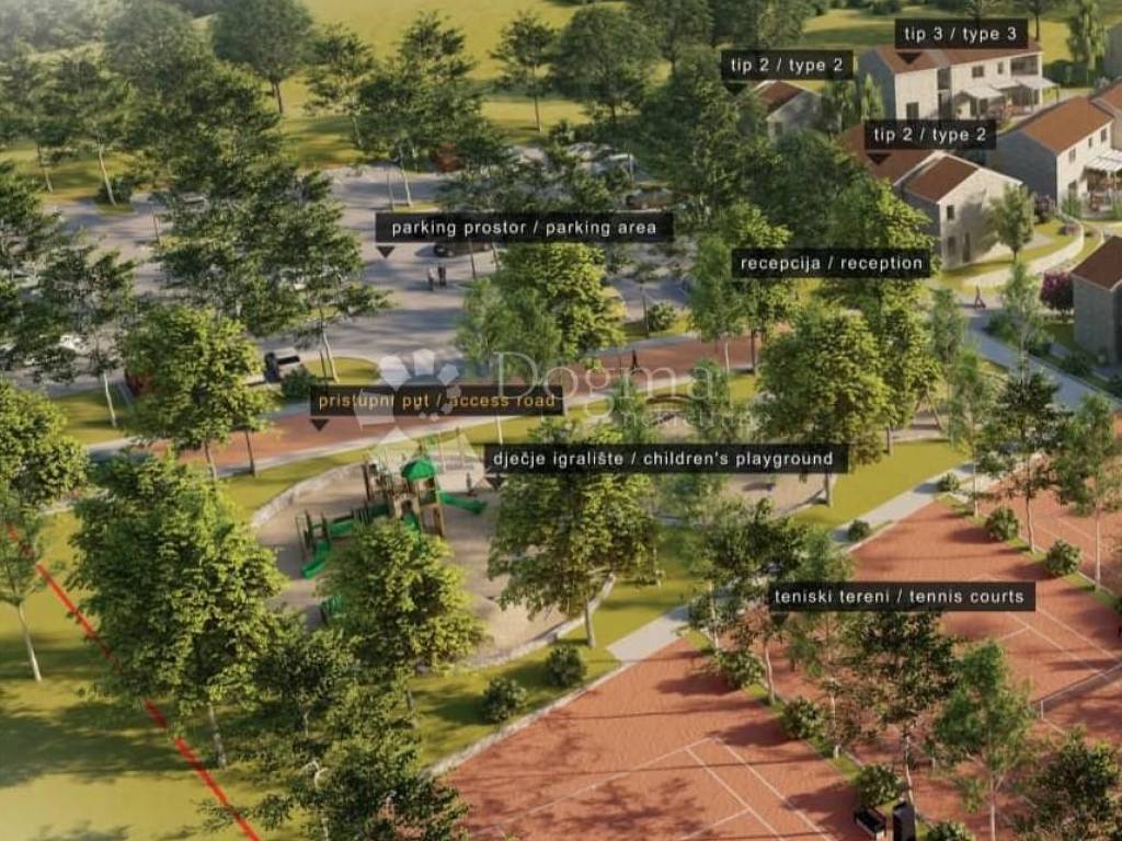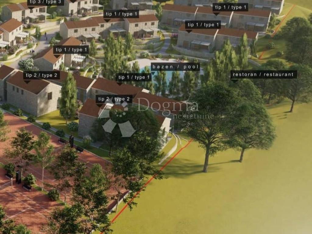 Idejnim je projektom prikazana jedna od mogućih varijanti gradnje, predviđeno je turističko naselje sa 25 smještajnih objekata koji posjeduju još i restoran, bazen, teniske terene, dječje igralište i parking prostor.