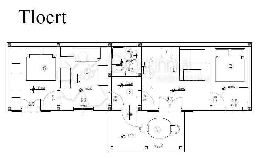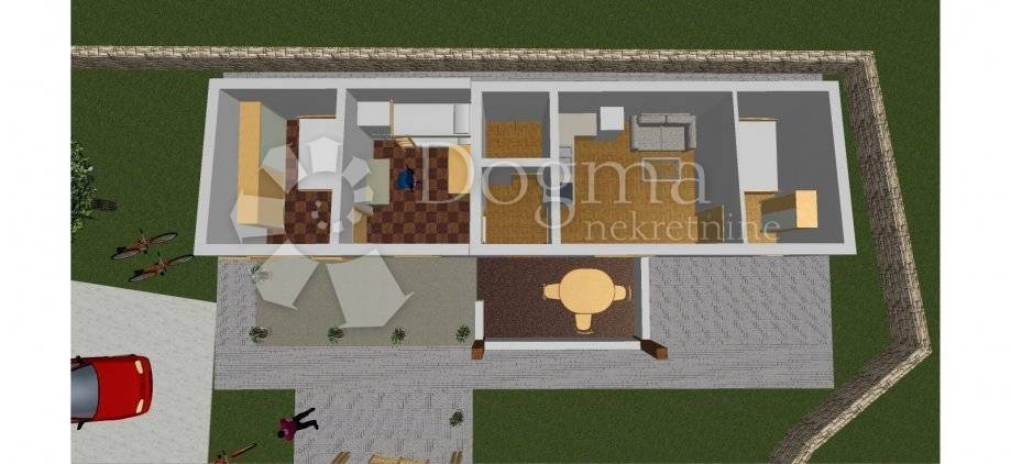Objekt se sastoji od 3 sobe, dnevnog boravka, kuhinja, hodnik i wc, te ispred objekta se nalazi natkrivena terasa od 10 m.