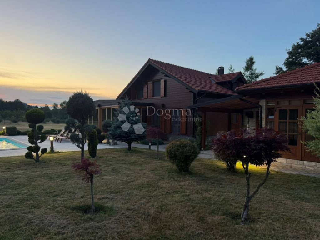 A large luxury estate of 17199 m2 is for sale located at the foot of the magnificent Velebit mountain, surrounded by untouched nature and complete peace. The property includes an exclusive wooden house with 4 existing buildings, a garage with 2 parking spaces, a summer kitchen with a barbecue (fully furnished), and a traditional house with a fireplace, made of natural materials, a combination of traditional construction and modern details. The house comes with a private swimming pool, ideal for relaxing during warm days, and offers a unique combination of mountain freshness and luxurious vacation with a spacious covered terrace and a winter garden that offers a panoramic view of the Velebit massif. Hidden in the greenery at the foot of the Velebit mountain, this luxury estate offers the perfect refuge for an escape from everyday life. The authentic wooden house exudes warmth and natural charm, while the private pool ensures complete relaxation and enjoyment. Ideal for lovers of nature, active vacations and superior comfort. The house consists of a ground floor and an upper floor. Ground floor: hallway, storage room, central heating room (pellet), living room, dining room, kitchen, toilet. First floor: 4 bedrooms, bathroom. Auxiliary facilities are decorated with carved Lika stone, which literally represents a form of art and quality. Enameled first-class wood, double insulation, oak floors, aluminum multi-chamber joinery with shutters and mosquito nets, high-quality sliding glass walls, a top-notch heating system for both the house and the pool, are just part of the construction that makes this property magnificent. The property comes with complete machinery for the property (tractors, lawnmowers, trimmers, chainsaws). A high-power external generator, in case of storms, provides electrical energy for the entire property, and water from the well, spring water at the foot of Velebit supplies the house and complete irrigation of the green areas of the garden, orchards, with first-class quality drinking water. The entire property is fenced, covered by video surveillance and an alarm system, and the location tucked away in the forest 100 m from the main road ensures privacy, peace and quiet. When you exit the main road, you are only a few kilometers away from the highway junction. Ownership and papers are in order 1/1. Contact us with confidence, Nikola 0923827530 Ivan 0994444979