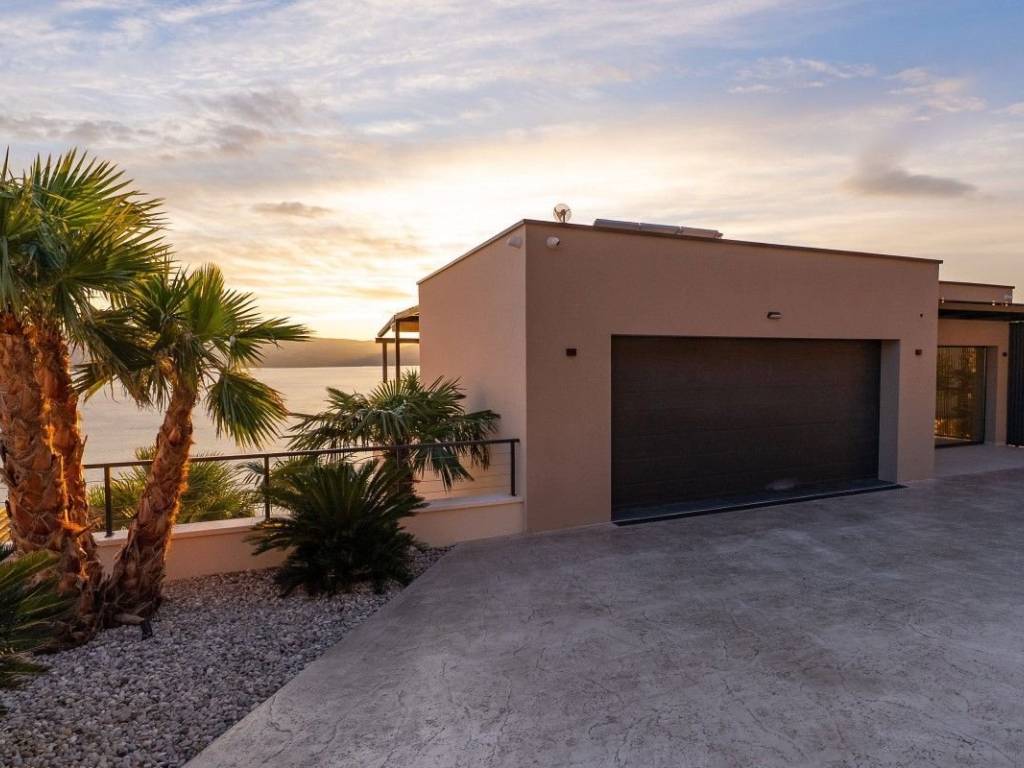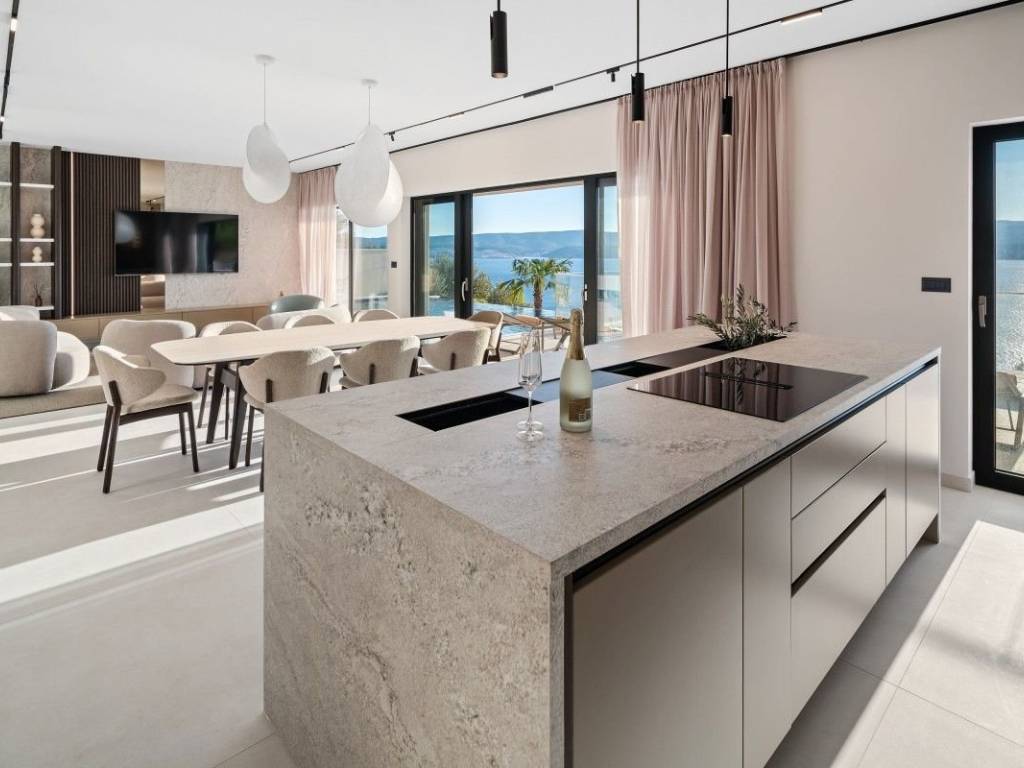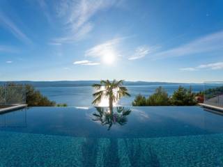 For sale is a luxurious villa with a modern design, located in a quiet village not far from Omiš, only 250 meters from the sea. The villa is built in reinforced concrete construction, with excellent thermal and sound insulation and the use of the highest quality materials. The total area of ​​the land is 600 m², while the living area is 450 m².   The facility consists of several floors with a carefully designed layout. On the top floor there is a master bedroom with a private bathroom and a spacious terrace of 44 m², next to which there is also a double garage inside the building. The first floor includes four bedrooms, each with its own bathroom, and a wardrobe area with an island. The ground floor is designed as an open living room with a kitchen and dining room, from which there is access to a covered terrace and pool. The lower floor offers a space for relaxation with a home cinema, a sauna, a fitness area and a laundry room, and all rooms offer a panoramic view of the sea.   The villa is equipped with a Daikin air conditioning system, underfloor heating in the bathrooms and aluminum joinery. The swimming pool is equipped with heating, electrolysis and counter-current swimming. The property has a garage and parking space and is sold fully furnished and ready to move into.