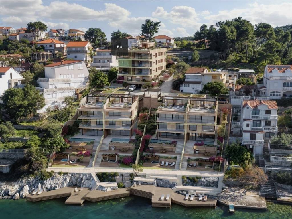 A unique apartment with a spacious balcony in the second row to the sea is offered in an excellent location in Okrug Donji. Located in the immediate vicinity of the sea, with a beautiful view and direct access to the sea, oriented to the northeast, it fits perfectly into the Mediterranean environment. The apartment is located in a residential building with a total of seven apartments, and access is provided from the south. The apartment is not only part of a luxury apartment complex, but a comprehensively designed space for living, rest and relaxation. This newly built apartment equipped with an elevator is located on the second floor of the building with an open panoramic view of the sea. It has 104,45 m² of living space and consists of a living area with access to a balcony with a sea view, a hallway, anteroom, two bedrooms and two bathrooms. The biggest advantage of the apartment is its outdoor area of 13,69 m², which creates an impression of privacy. Only a few steps separate the owner from a well maintained sunbathing area on the coast, and of the additional facilities located in the building, the most notable is the shared roof terrace with lounge seats and an open view of the sea, the gym and saunas in the basement and the swimming pool that is for the common use of all residents. There is a garage parking space in the basement of the building, and there is also the option of purchasing an additional garage parking space. Top quality materials are used in the construction and furnishing (high class tiles and sanitary ware, air conditioner in each room, security doors etc.), and there is also the option of completing the apartment’s decoration in cooperation with experienced interior designers. The prime location is characterized by the distance to the airport of only 13 km, the proximity of all amenities on the island and the cities of Trogir and Split. The immediate proximity of the sea, crystal clear sea and the surrounding nature make this location an ideal place to relax throughout the year. Considering the many facilities, the apartment is an excellent choice for all those looking for a property in a prime location, in close proximity to the sea.
