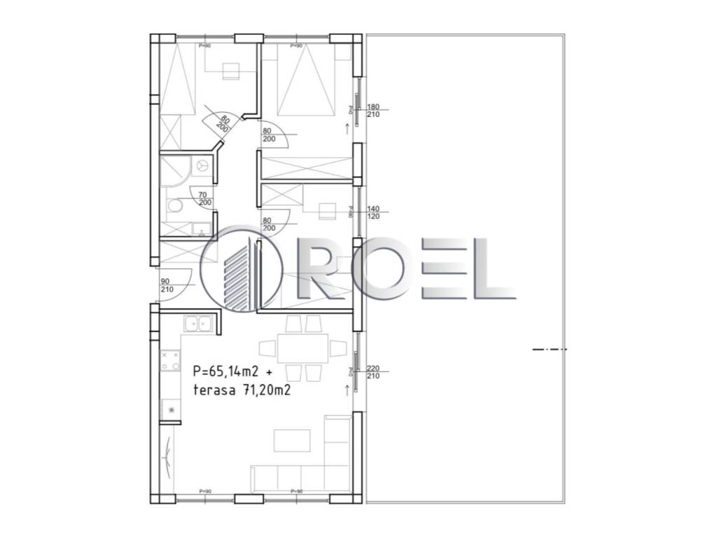 Four-room penthouse with a large terrace on the third floor of a new building in a quiet street in Zaprešić. NKP 82.94 m2. It consists of an entrance hall, three bedrooms, a bathroom with toilet, an open space living room with kitchen and dining room with access to a large terrace of 71.20 m2 (17.80 m2). The apartment is oriented to the east, west and south, which makes it extremely bright throughout the day, and the terrace and interior spaces enjoy an open view of Sljeme. The living area of the apartment is 65.14 m2. The floor in the apartment will be covered with parquet and ceramics. The heating in the apartment will be underfloor gas. It will be equipped with PVC joinery and a color video intercom.