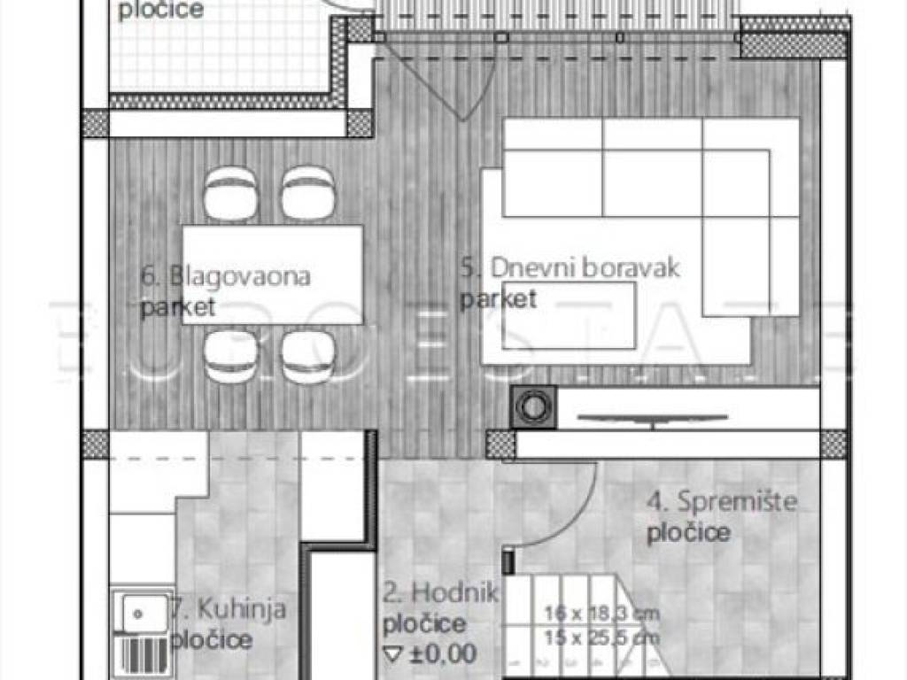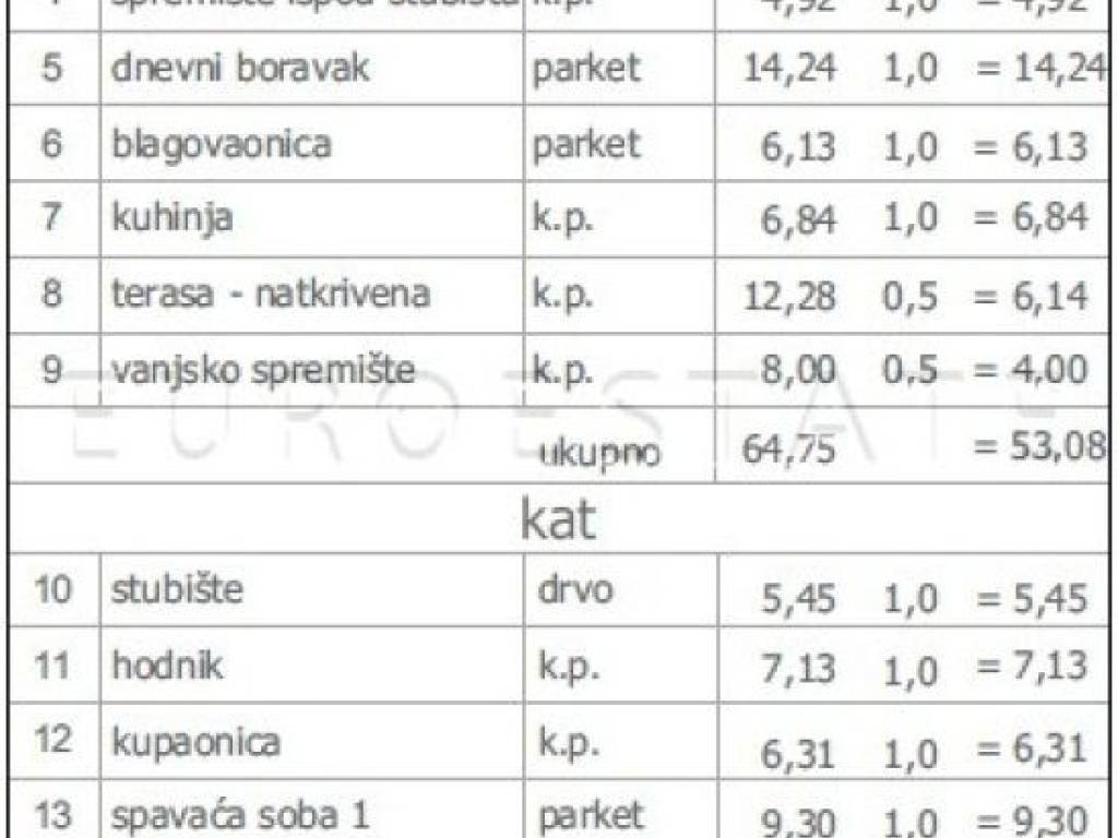 PRIZEMLJE: natkriveni ulaz, hodnik, WC, spremište ispod stubišta, dnevni boravak, blagovaonica, kuhinja, natkrivena terasa, vanjsko spremište