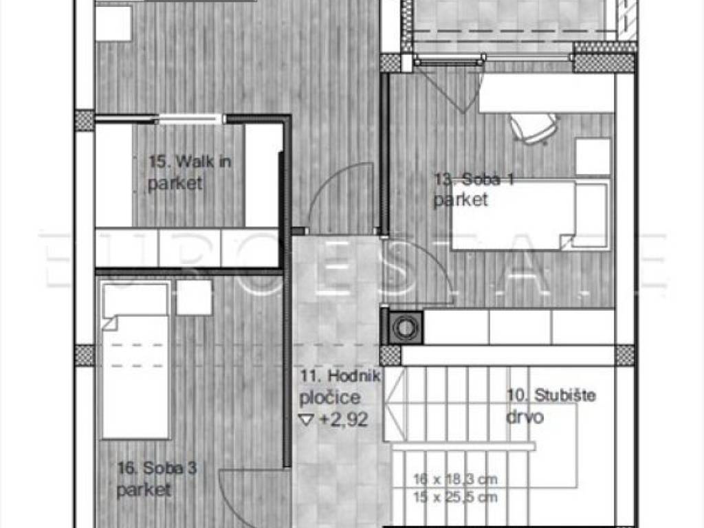 KAT: stubište, hodnik, kupaonica, spavaća soba 1, spavaća soba 2, walk-in ormar, spavaća soba 3, balkon