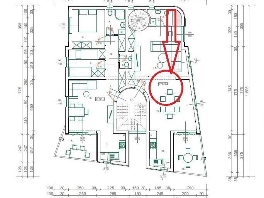 Stan S4 ( na tlocrtu označen crvenom bojom / ZGRADA B ) sastoji se na prvoj etaži od ulaznog prostora površine 2,32 m2 , kuhinje površine 5,86 m2, blagovaonice površine 17,65 m2 , dnevnog boravka površine 20,35 m2 , kupaonice površine 3,82 m2 i terase površine 8,61 m2. Na toj etaži prostor zauzimaju stepenice površinom 3,09 m2.