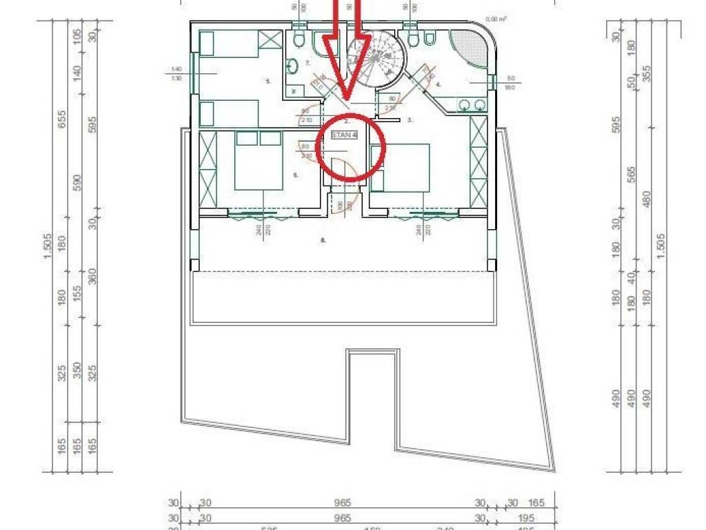 Na drugoj etaži stana nalazi se predsoblje površine 5,21 m2 , 3 spavaće sobe ( 14,01 m2 / 10,21 m2 / 10,54 m2 ) , 2 kupaonice ( 6,54 m2 / 3,89 m2 ) , stepenice koje zauzimaju površinu od 2,84 m2 te prostrana terasa površine 35,38 m2 na kojoj je pripremljena mogućnost postavljanja jacuzzija .