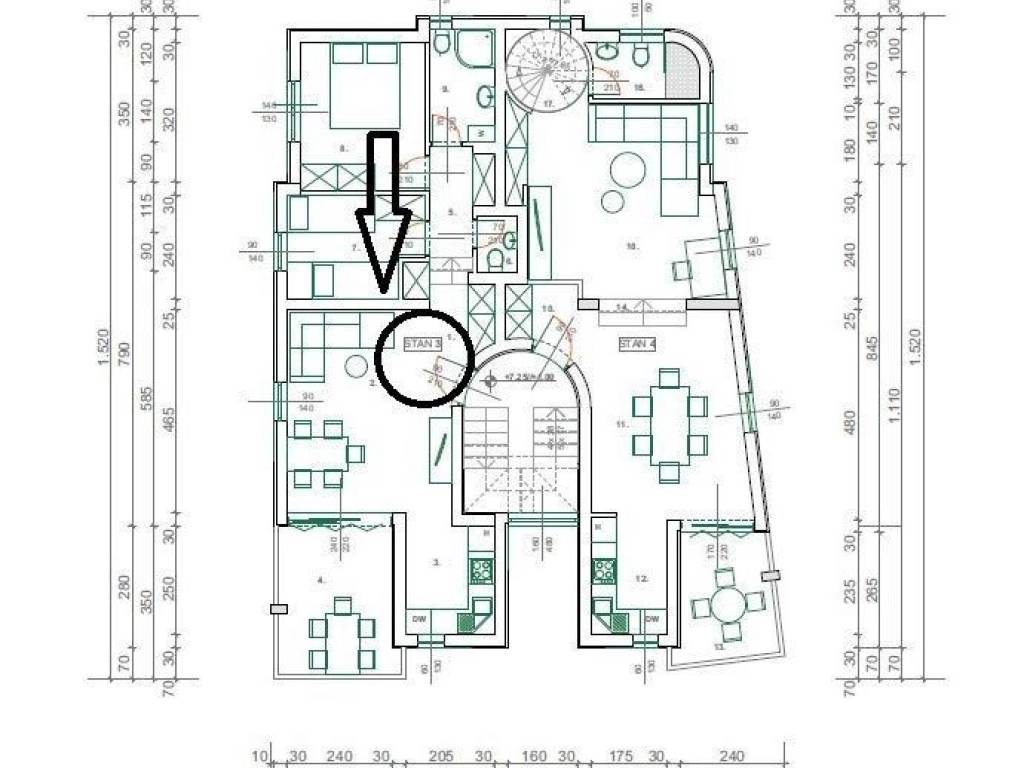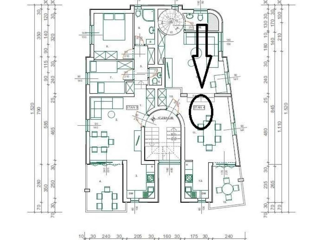 Stan S4 ( na tlocrtu označen crnom bojom / ZGRADA A ) sastoji se na prvoj etaži od ulaznog prostora površine 2,79 m2 , kuhinje površine 4,86 m2, blagovaonice površine 15,64 m2 , dnevnog boravka površine 19,41 m2 , kupaonice površine 3,13 m2 i terase površine 6,17 m2. Na toj etaži prostor zauzimaju stepenice površinom 3,07 m2 i 1,20 m2.