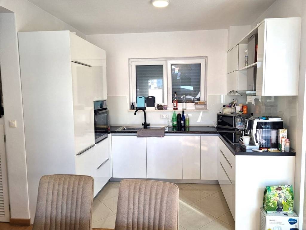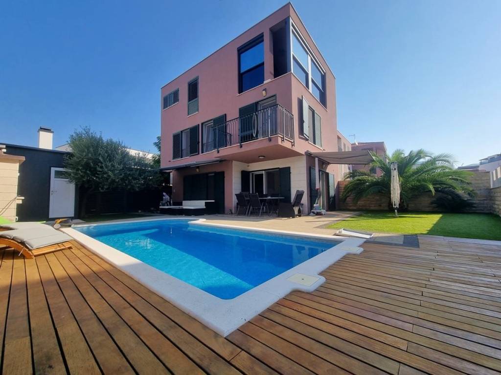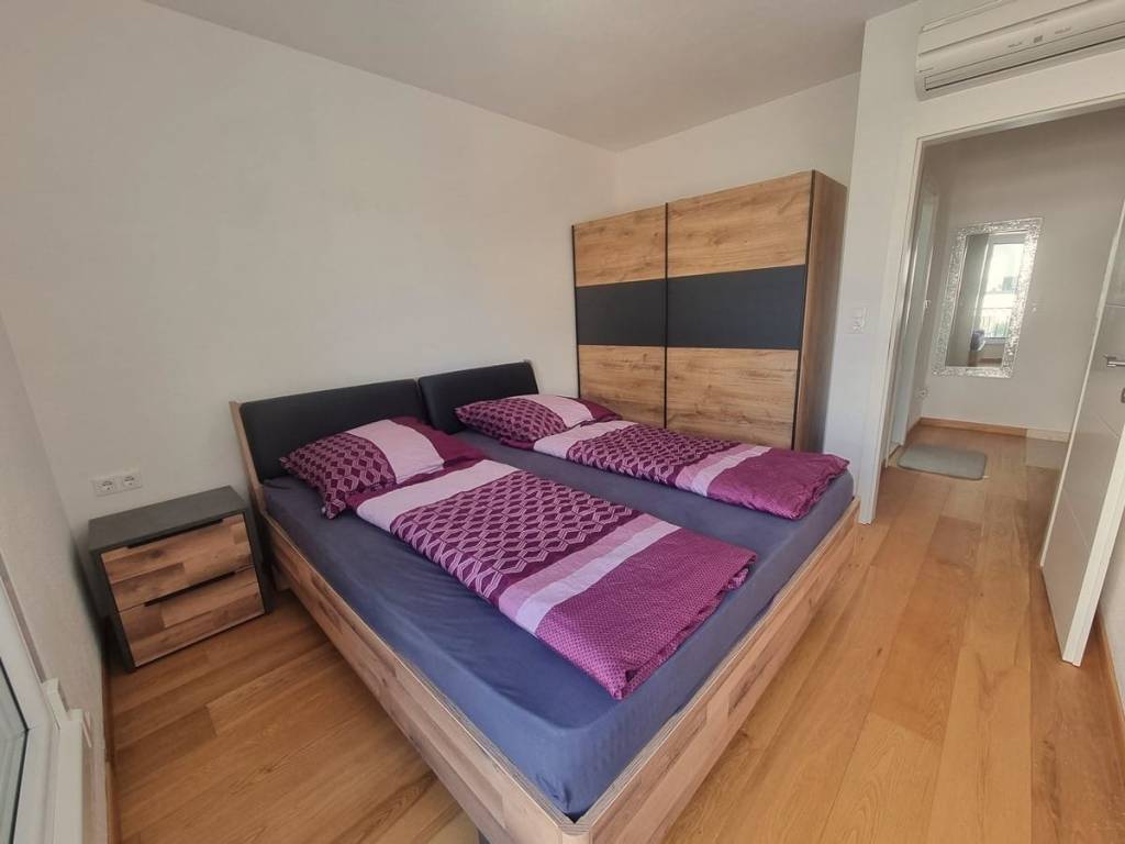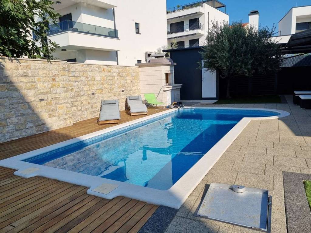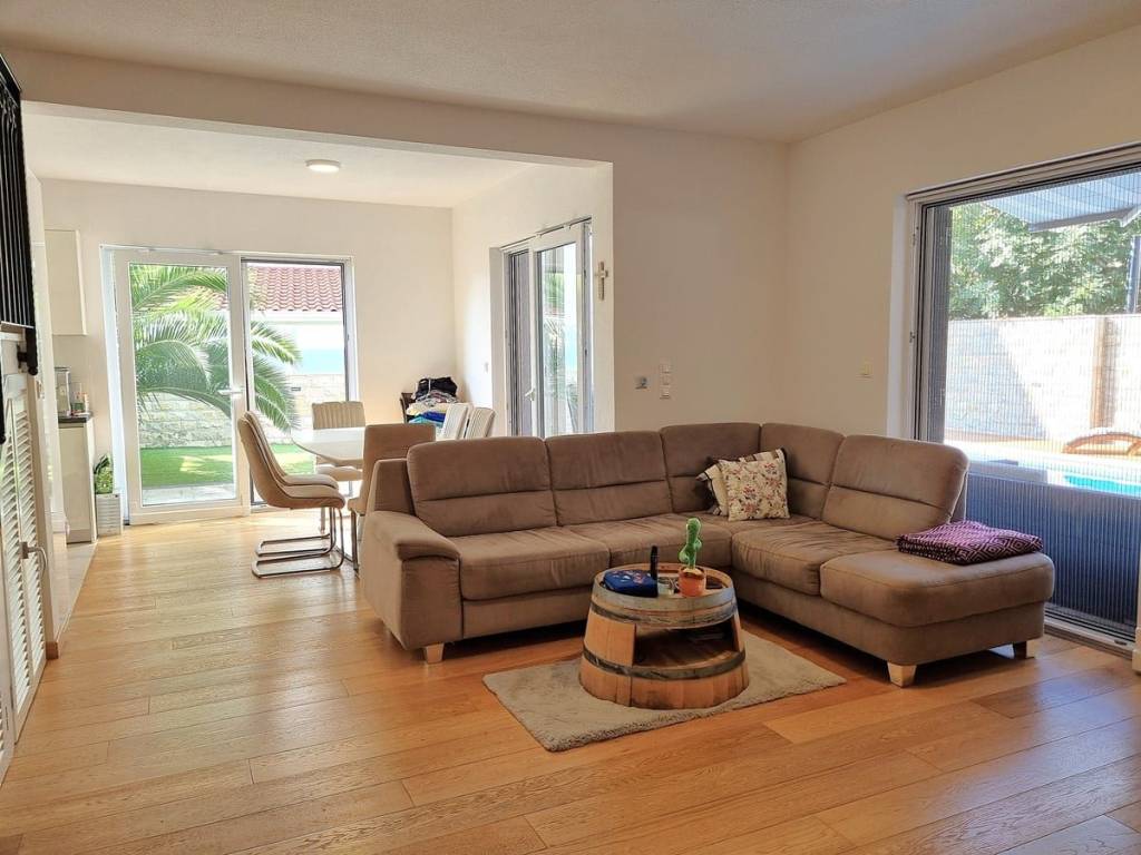 Spacious duplex apartment in a smaller residential building with a total of three residential units is for sale. The apartment is spread over the ground floor and first floor. The ground floor consists of a large living room, kitchen, dining room, storage and toilet. An internal staircase leads to the 1st floor, which contains a hallway, three bedrooms and two bathrooms. One of the bedrooms has a wardrobe, access to the bathroom and access to a small balcony. From the ground floor there is an exit to a spacious and landscaped garden with a swimming pool, sunbathing area, outdoor grill and storage room. The apartment has a total living area of 98.74 m2, with a garden of 150 m2 and a balcony of 3.84 m2. It also has one covered parking space. The apartment is fully furnished and equipped and is being sold as such. Modern apartment, very well maintained and warm space full of light. There is electric underfloor heating throughout the apartment, and all rooms are air-conditioned. It is ideal for living, for vacation, but also as a rental property for tourist purposes. The apartment is oriented towards the southwest. The air distance from the sea and the beach is only 250 m. It is also 4 km away from Trogir, 9 km from Split airport, and 30 km from the Split city center.