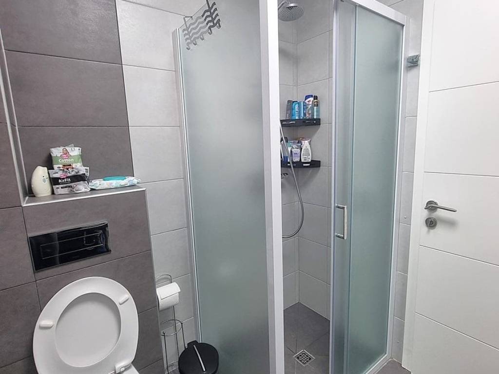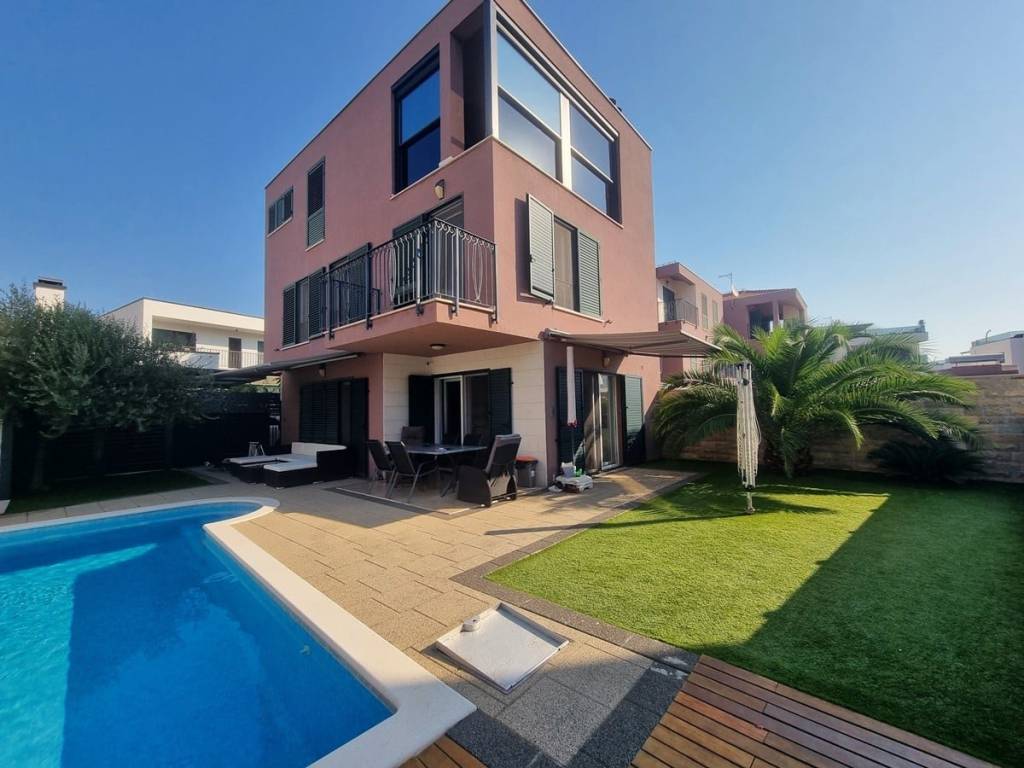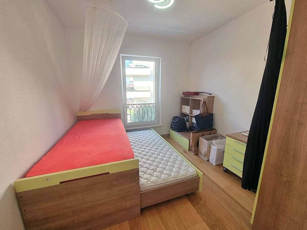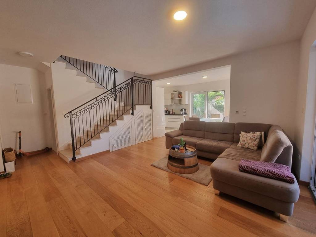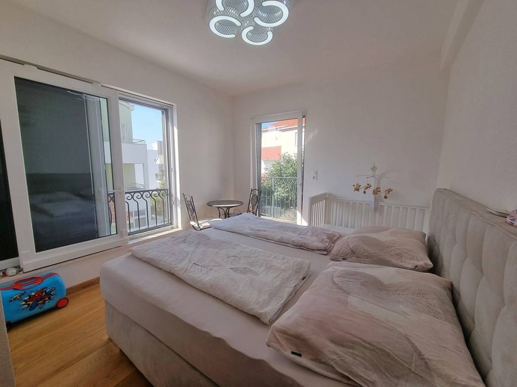 Spacious duplex apartment in a smaller residential building with a total of three residential units is for sale. The apartment is spread over the ground floor and first floor. The ground floor consists of a large living room, kitchen, dining room, storage and toilet. An internal staircase leads to the 1st floor, which contains a hallway, three bedrooms and two bathrooms. One of the bedrooms has a wardrobe, access to the bathroom and access to a small balcony. From the ground floor there is an exit to a spacious and landscaped garden with a swimming pool, sunbathing area, outdoor grill and storage room. The apartment has a total living area of 98.74 m2, with a garden of 150 m2 and a balcony of 3.84 m2. It also has one covered parking space. The apartment is fully furnished and equipped and is being sold as such. Modern apartment, very well maintained and warm space full of light. There is electric underfloor heating throughout the apartment, and all rooms are air-conditioned. It is ideal for living, for vacation, but also as a rental property for tourist purposes. The apartment is oriented towards the southwest. The air distance from the sea and the beach is only 250 m. It is also 4 km away from Trogir, 9 km from Split airport, and 30 km from the Split city center.