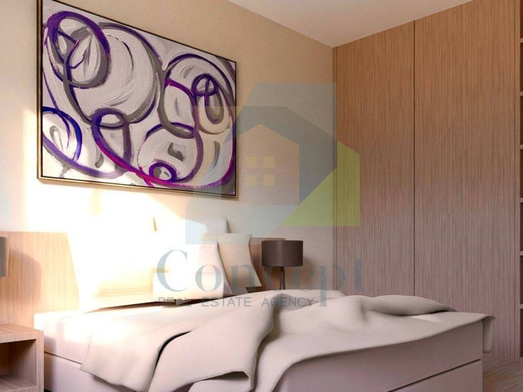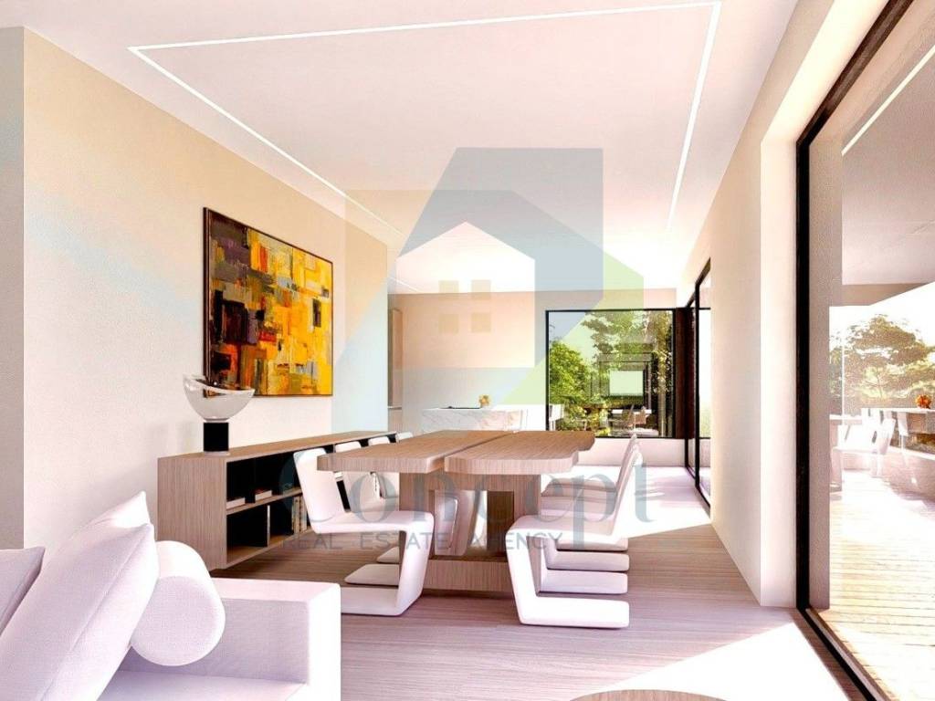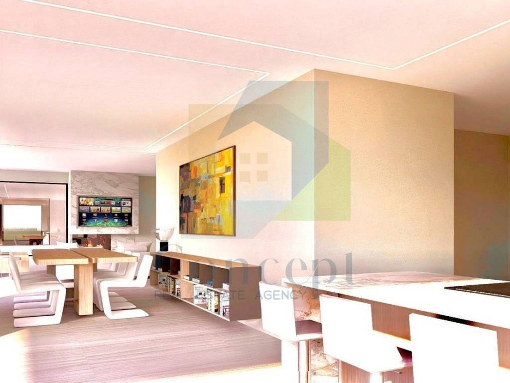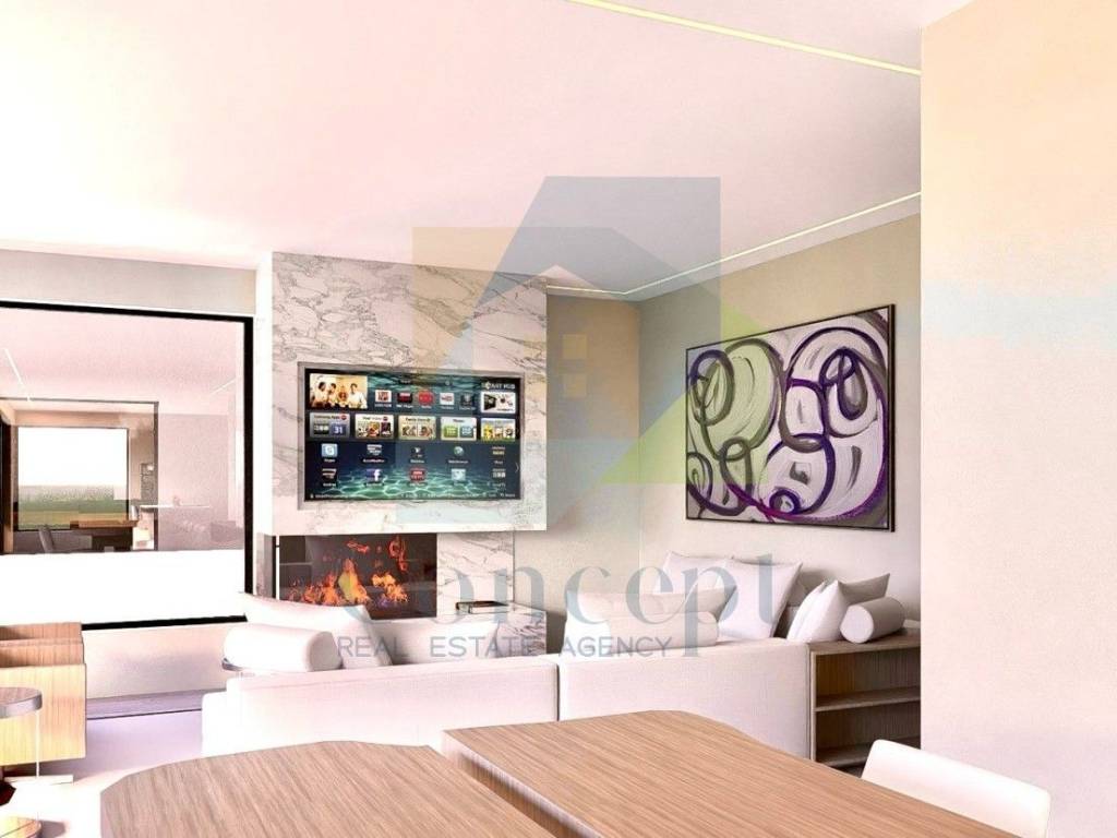 L'appartamento è composto da un ampio soggiorno, cucina e sala da pranzo in open space con accesso a una terrazza coperta di 36 m. La disposizione degli spazi è progettata per un soggiorno piacevole con molta luce naturale.
