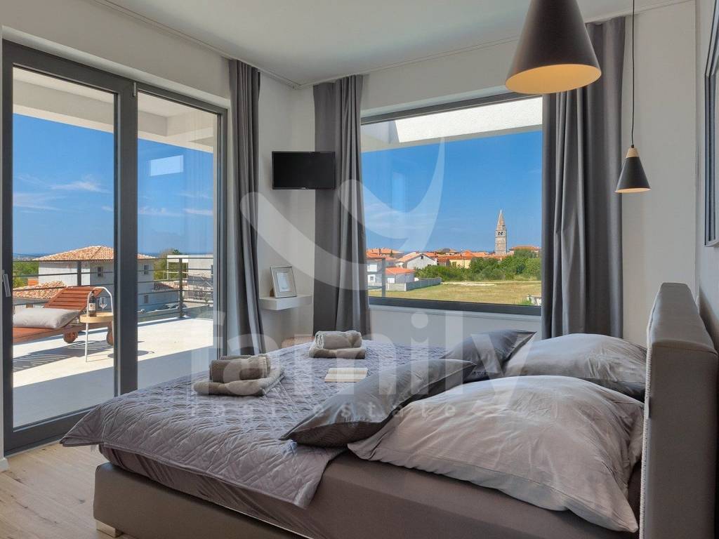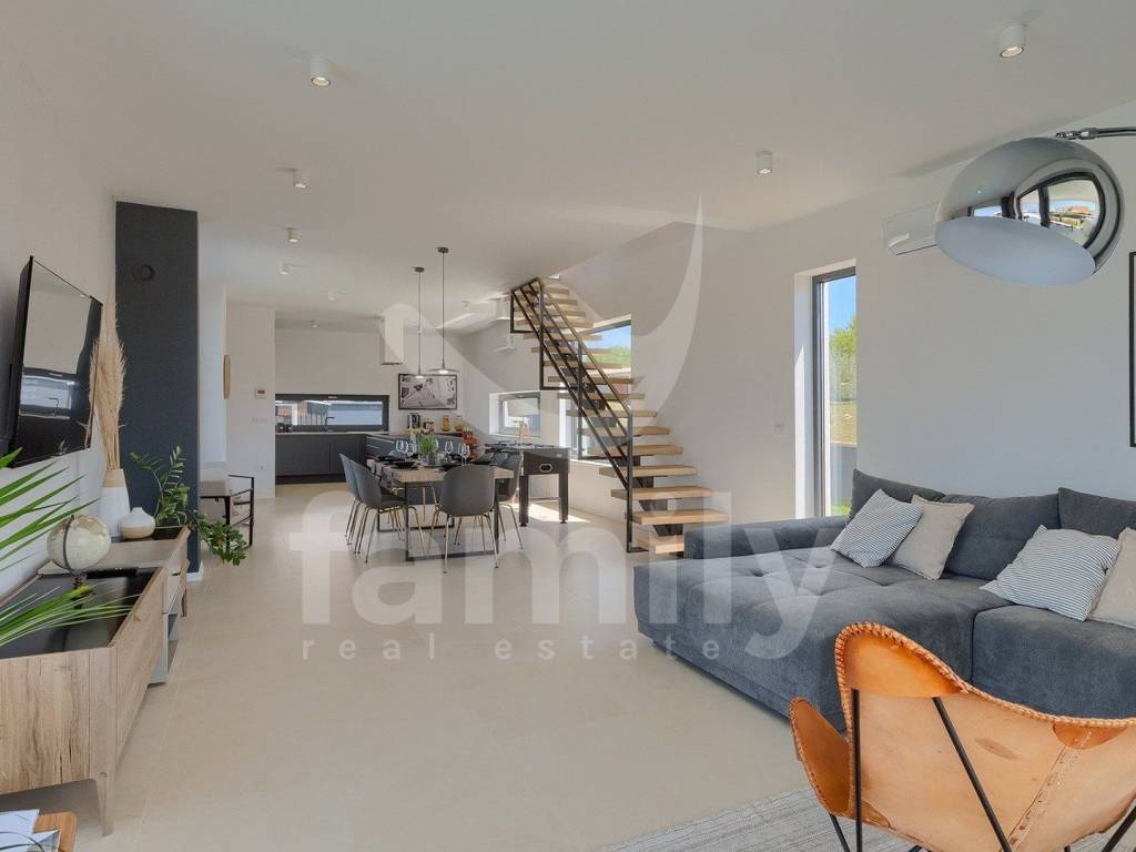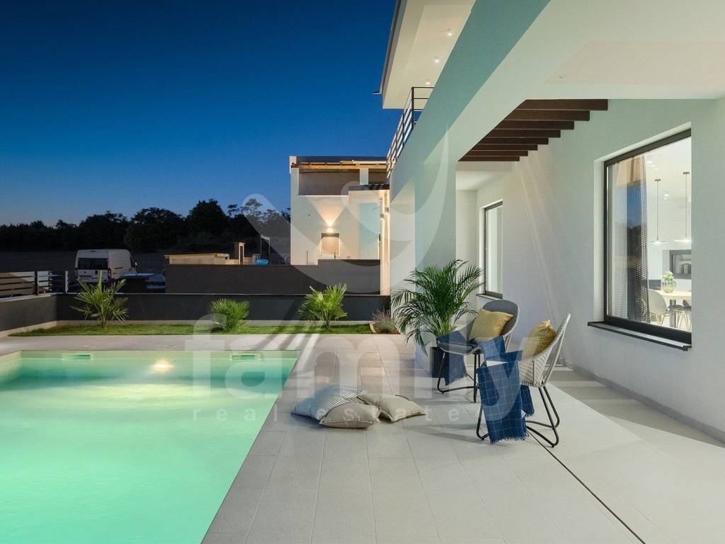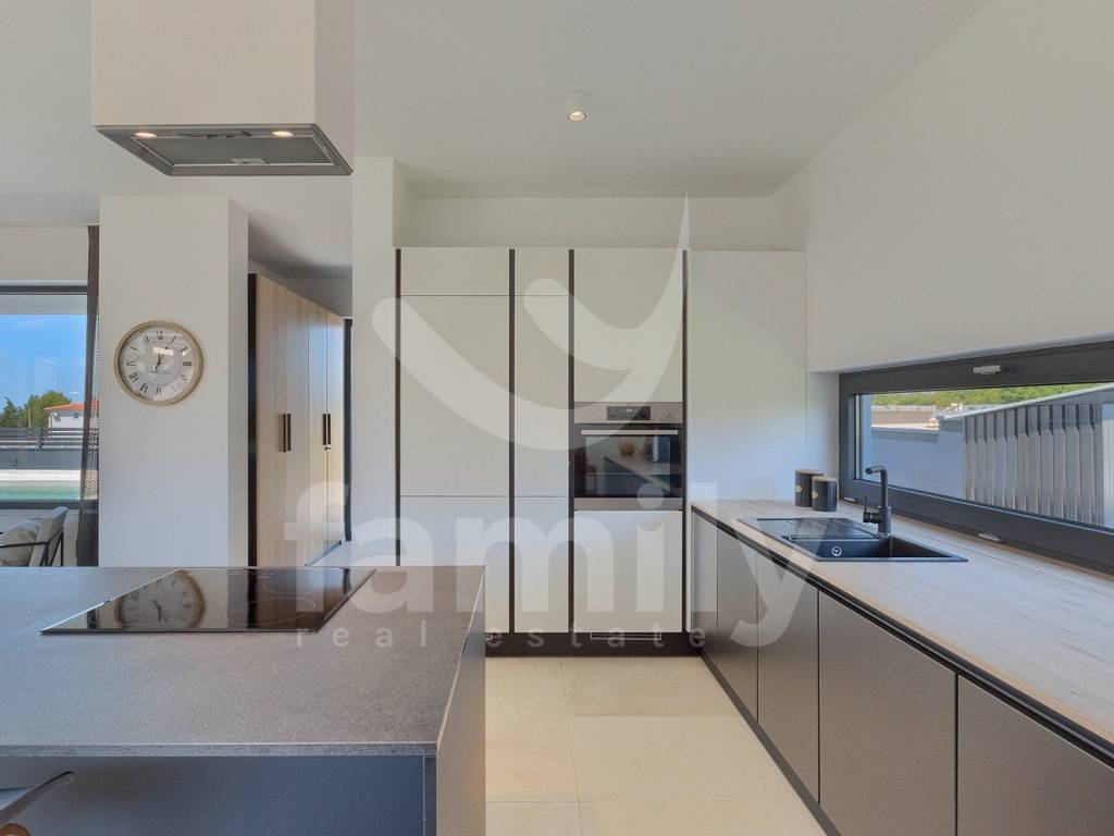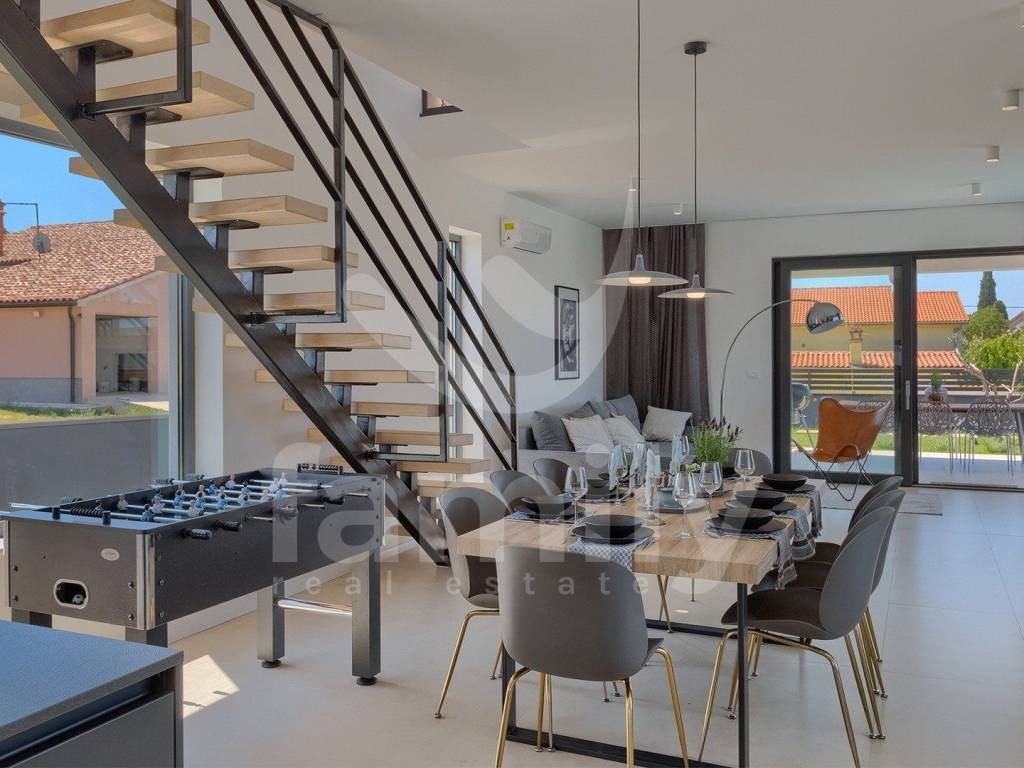 This beautiful villa with a total area of 170 m2 on a plot of 331 m2 is located in Galižana. It extends over two floors, ground floor and first floor, and on the ground floor there is a spacious, bright open concept living room with kitchen and dining room and access to a spacious terrace and the property's plot and a bathroom, while on the first floor there are three bedrooms with a spacious terrace overlooking the sea and the Brijuni Islands. Two rooms share a terrace, while the master bedroom has a separate one, and there is also a spacious bathroom on the first floor. The villa is fully equipped in a modern way and has anthracite-colored PVC joinery, a chimney, five inverter air conditioner units and video surveillance for complete security. The yard of this beautiful and modern villa is meticulously maintained and has everything you need for a pleasant outdoor stay, and there is, in addition to a spacious terrace with an outdoor kitchen and barbecue, a sunbathing area with a 36 m2 swimming pool and underwater lighting, a lawn with irrigation, an outdoor shower, as well as a sufficient number of umbrellas and deck chairs for complete comfort.