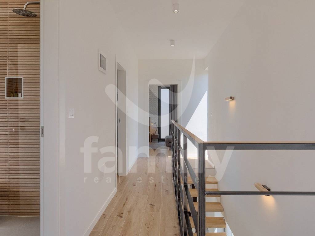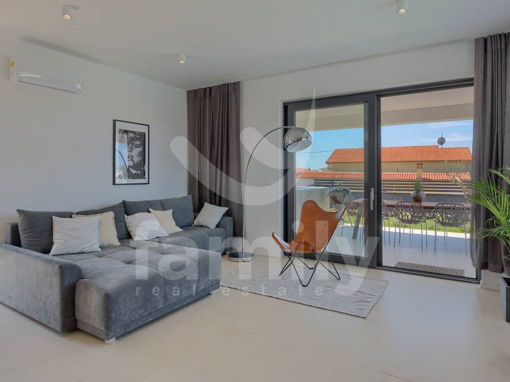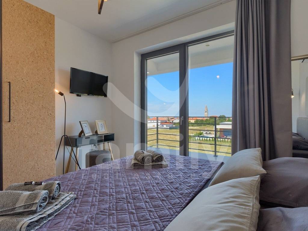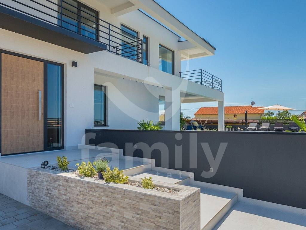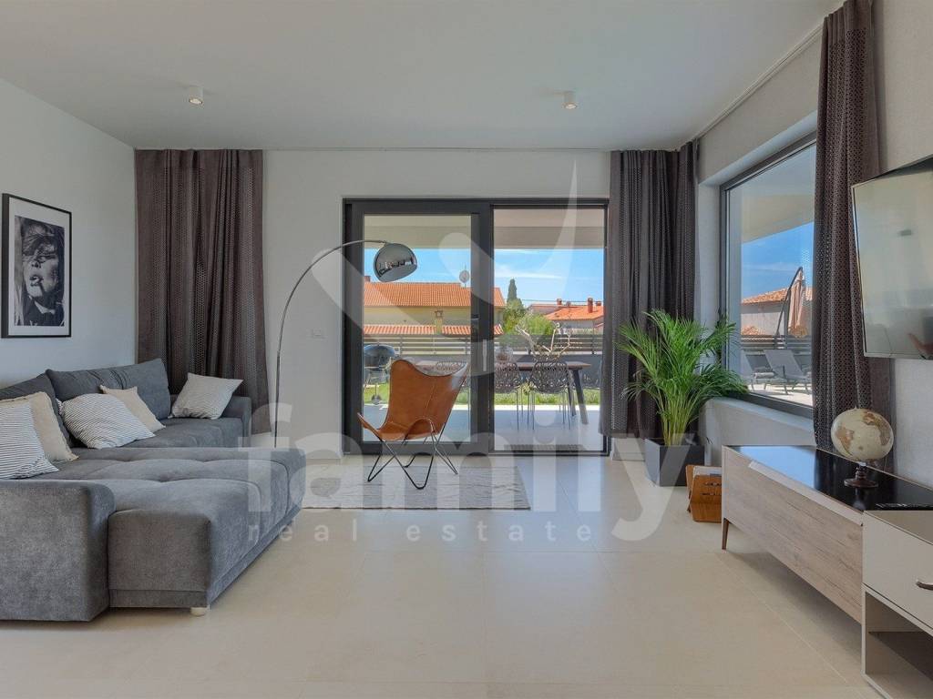 This beautiful villa with a total area of 170 m2 on a plot of 331 m2 is located in Galižana. It extends over two floors, ground floor and first floor, and on the ground floor there is a spacious, bright open concept living room with kitchen and dining room and access to a spacious terrace and the property's plot and a bathroom, while on the first floor there are three bedrooms with a spacious terrace overlooking the sea and the Brijuni Islands. Two rooms share a terrace, while the master bedroom has a separate one, and there is also a spacious bathroom on the first floor. The villa is fully equipped in a modern way and has anthracite-colored PVC joinery, a chimney, five inverter air conditioner units and video surveillance for complete security. The yard of this beautiful and modern villa is meticulously maintained and has everything you need for a pleasant outdoor stay, and there is, in addition to a spacious terrace with an outdoor kitchen and barbecue, a sunbathing area with a 36 m2 swimming pool and underwater lighting, a lawn with irrigation, an outdoor shower, as well as a sufficient number of umbrellas and deck chairs for complete comfort.