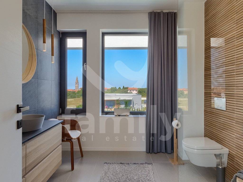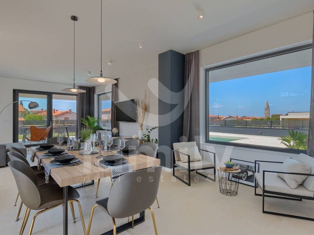 each with its own bathroom and terrace with a beautiful view of the sea and the Brijuni Islands. The yard, which is rich in content, has a swimming pool with a sunbathing area, a summer kitchen, a covered terrace, a children's playground, and parking spaces. The villa is completely, high-quality decorated and beautifully designed with style and top-quality furniture and all household elements and appliances, while the heating and cooling system is regulated by air conditioning in each room.
