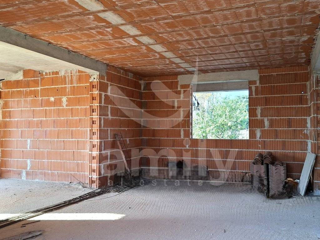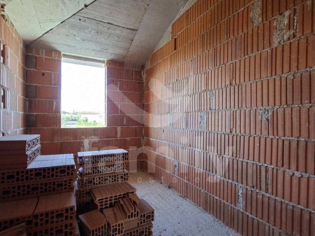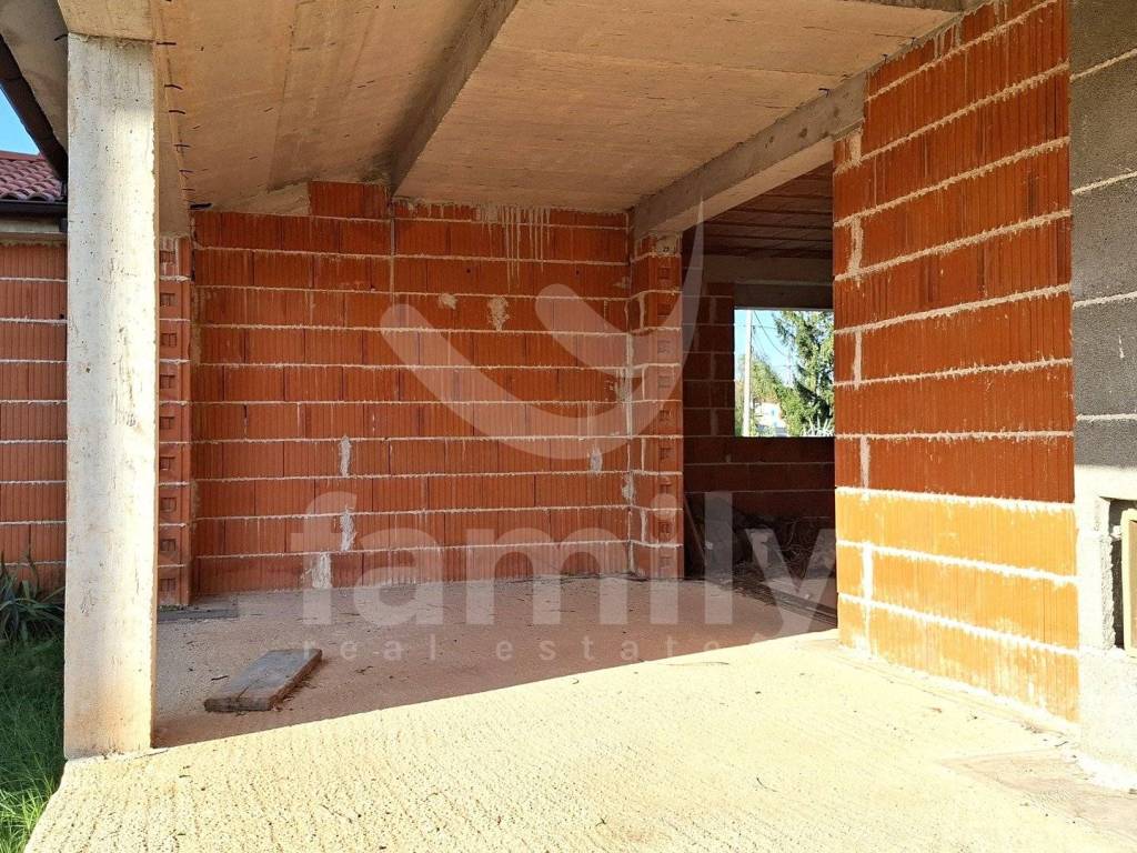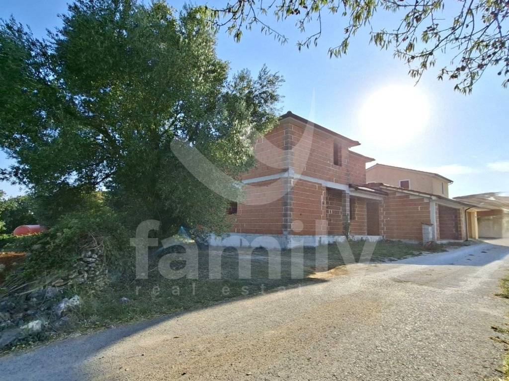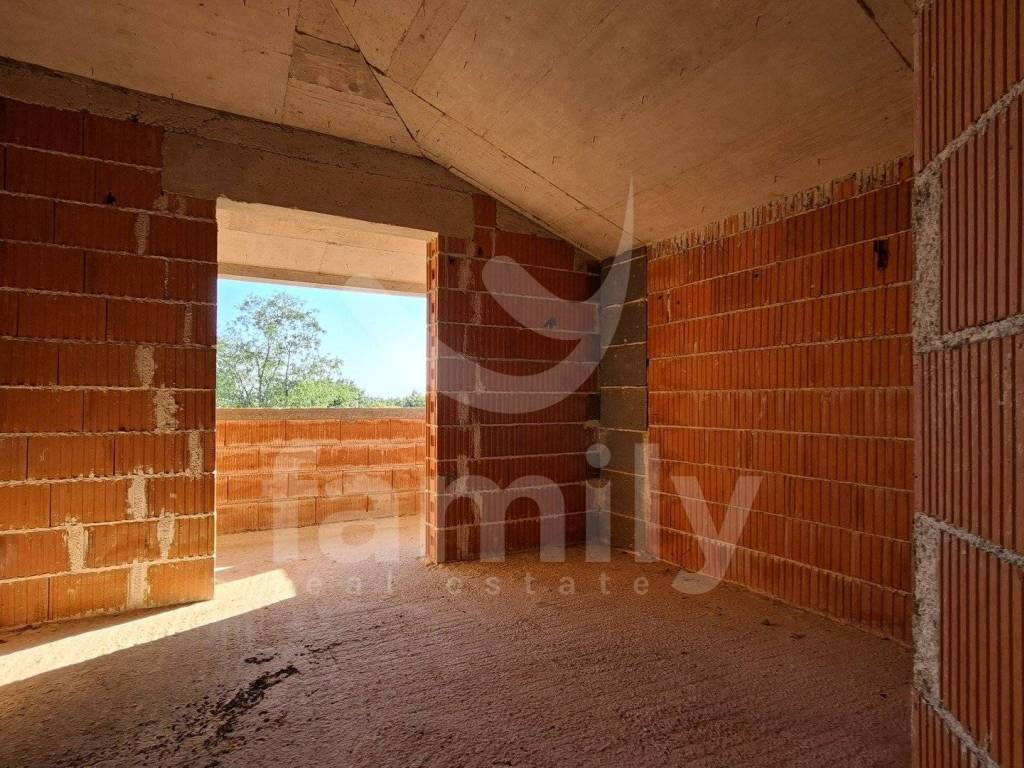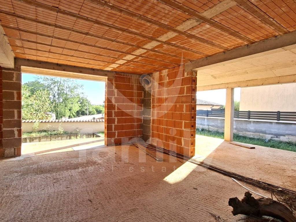 Within the municipality of Marčana, in a quiet place not far from Filipana, a comfortable family house in the unfinished stage is for sale. The house is spread over two floors and has a living area of 178 m2 with a garden of 394 m2. The ground floor of the property consists of an entrance hall, a spacious living room with access to a covered terrace, a kitchen connected to the dining room, as well as two storage rooms and a toilet. Internal concrete stairs leading to the first floor of the property consist of three bright bedrooms, one of which is en-suite, and the next two rooms have access to a spacious terrace and an extra bathroom. The garden also includes a swimming pool and a garage for two cars or a comfortable workshop.