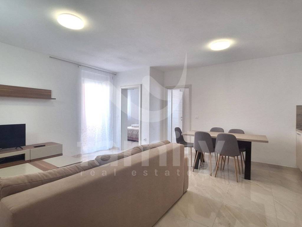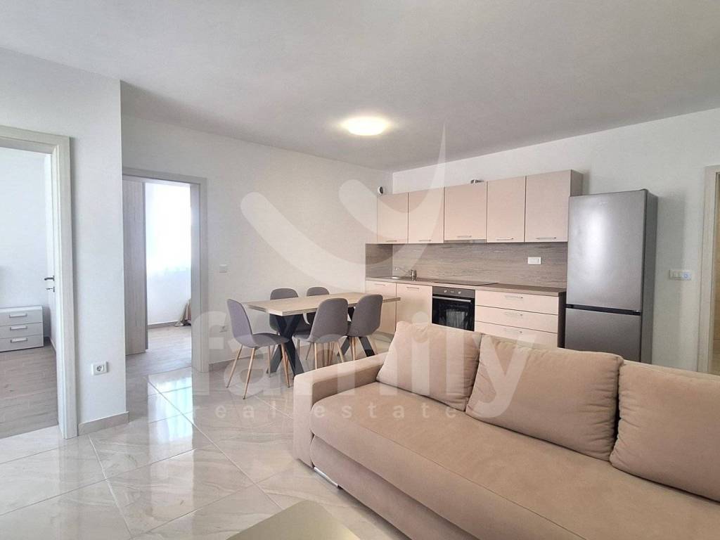 An attractive apartment of 61 m2 is for sale, located on the second floor of a small building with a total of 10 residential units. The apartment consists of a functional entrance area with a built-in shoe rack, a bright living room with access to a loggia, and a modern kitchen and dining room. The kitchen is fully equipped with a Gorenje induction hob, oven, dishwasher and self-filtering hood. The property also consists of two bright bedrooms and a bathroom equipped with a walk-in shower, water heater and prepared installations for a washing machine. The property is also equipped with an air conditioning unit, while additional comfort is provided by electric underfloor heating. High-quality PVC joinery with double glazing, 7 gas chambers and 10 cm thick thermal facades have been installed, which ensures excellent thermal and sound insulation. The floors are covered with high-quality ceramics and the apartment is sold fully furnished and with one parking space.