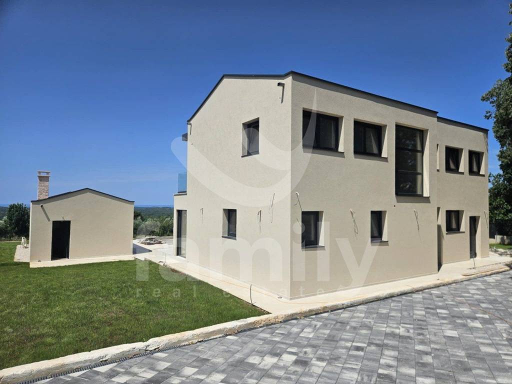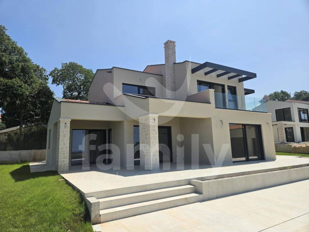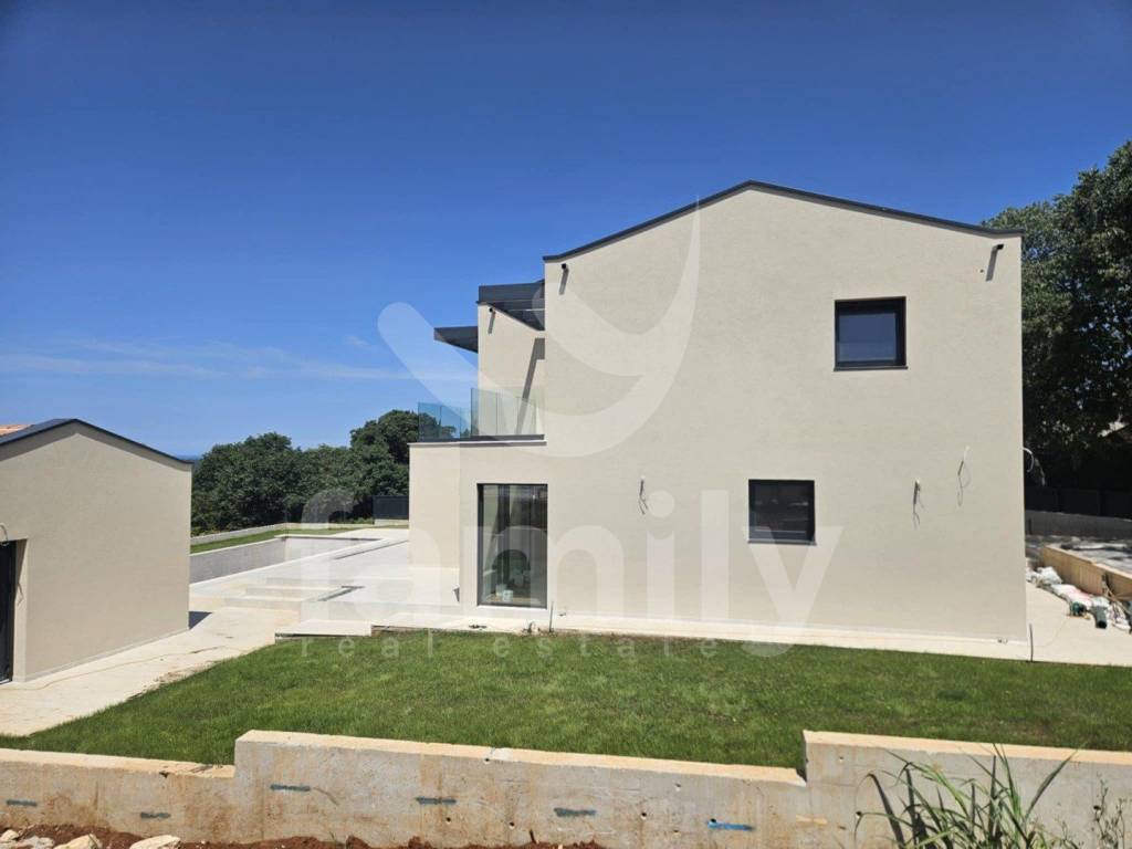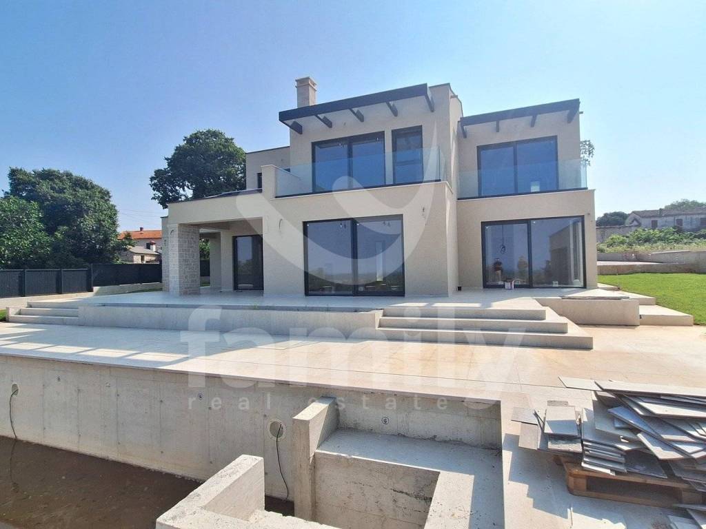 Not far from the city of Poreč, an imposing villa with a view of nature and the sea is for sale. It is located in a charming settlement with a panoramic view of the sea, the Alps and the surrounding area, surrounded by greenery, vineyards, olive groves, family houses and holiday homes, and was built to the highest standards for residential construction. The property's attractive exterior is perfectly integrated into the surrounding landscape, while the equally harmonious interior and harmoniously planned rooms are used. A large number of glass walls ensure maximum penetration of external light, which emphasizes the space and at the same time connects the interior with the exterior. The villa is designed as one residential unit spanning two floors.
