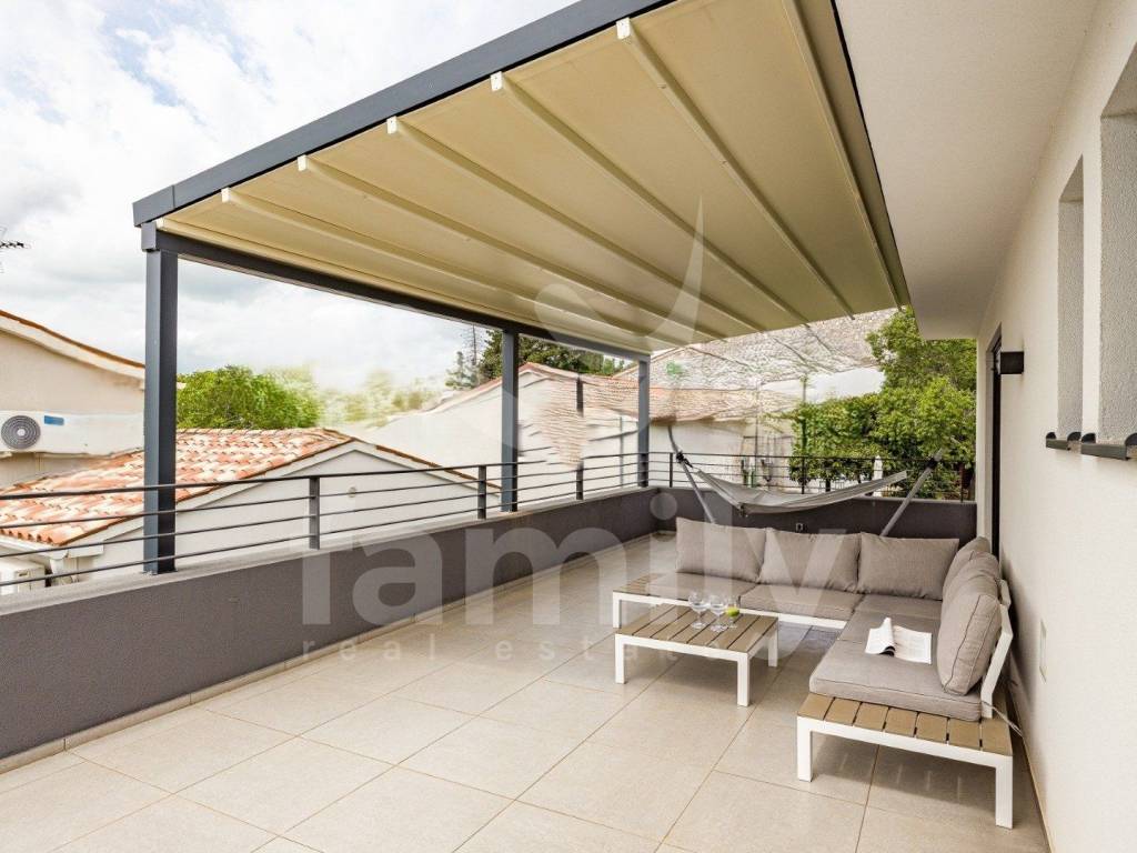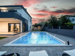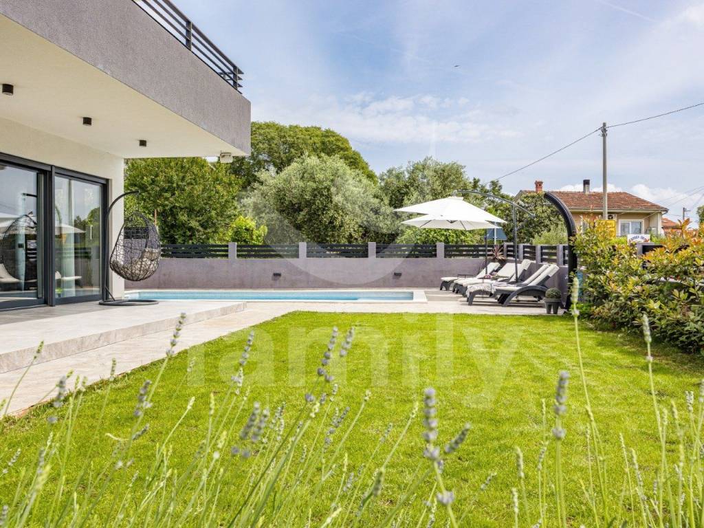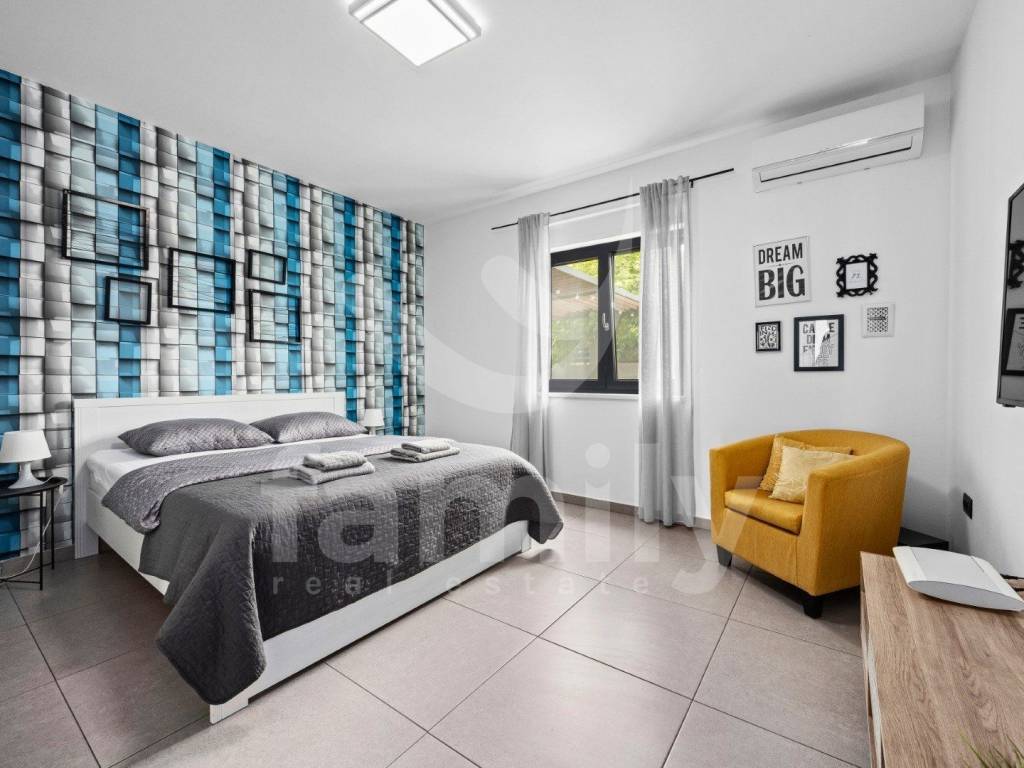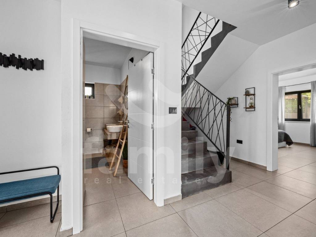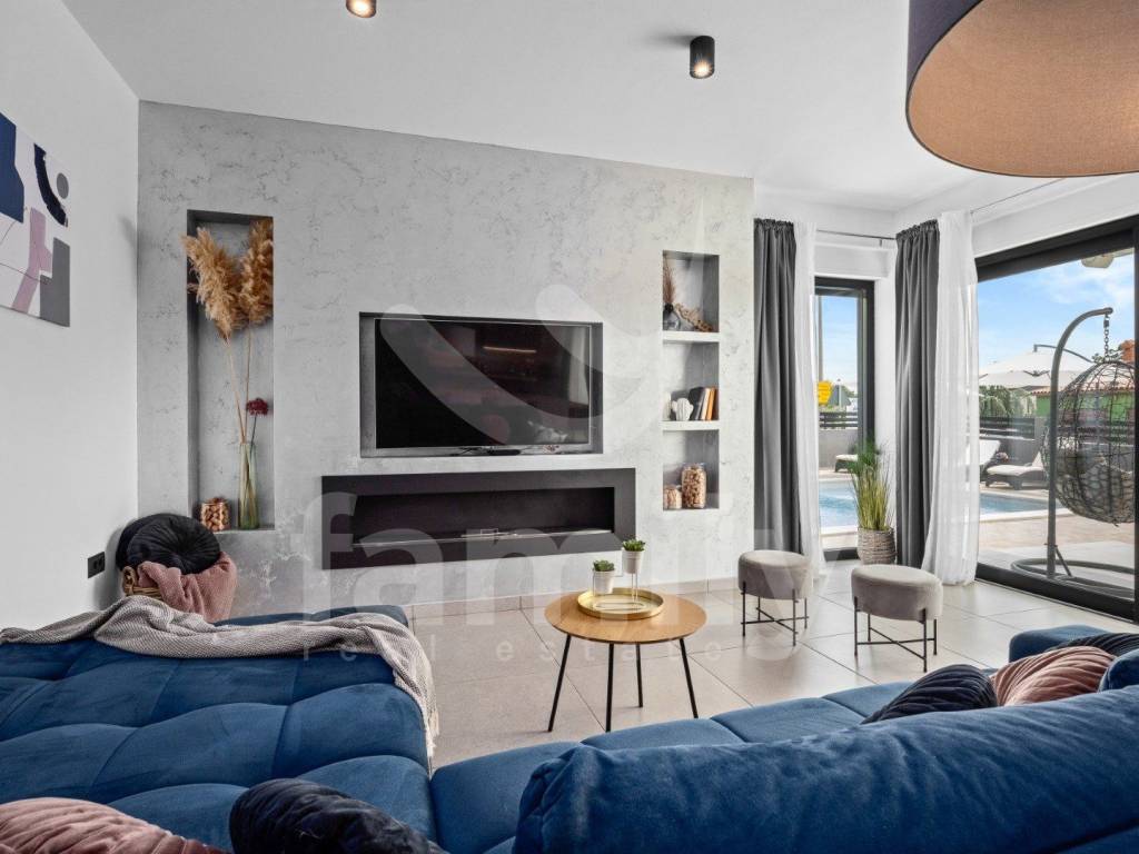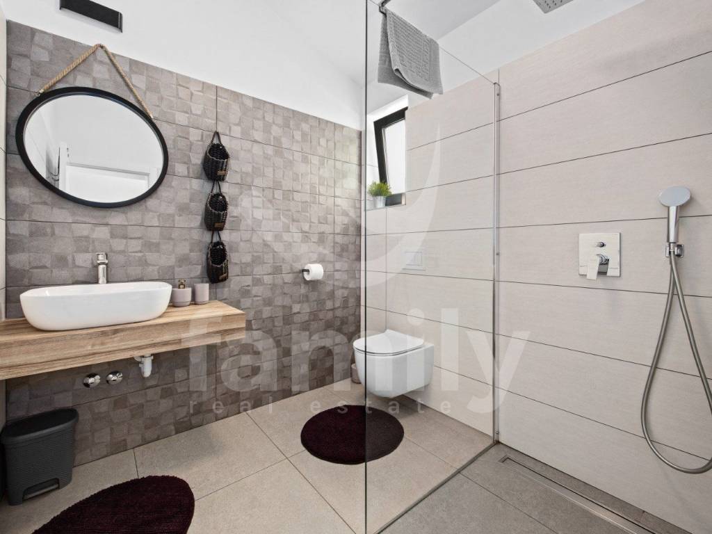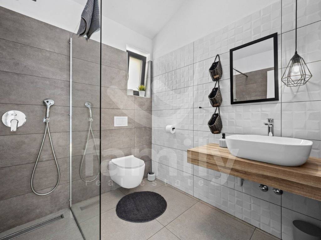 A villa with a total living area of 220 m2 that is sold equipped and furnished with everything you need for life or for tourism. The villa is equipped with modern, beautiful furniture with spacious rooms. The entrance area is spacious and all rooms are connected - dining room, living area, one bedroom and toilet. A modern staircase leads to the first floor, which is the only one that does not have an installed underfloor heating system. On the upper floor we have three spacious bedrooms with their own bathrooms and large daylight openings with anthracite-colored aluminum joinery in all rooms. All rooms and bathrooms are beautifully and well-equipped. From the rooms we have access to a very large terrace with a total area of 80 m2 from which we can enjoy a wonderful view while relaxing and resting on it. The terraces are very beautiful and completely covered with modern ceramics. The entire house is covered with ceramics and there is underfloor heating in the rooms and bathrooms. Everything is open-plan, whether on the first floor or ground floor, with large PVC sliding doors that lead to the terrace where you also have separate areas for relaxation, a part with a barbecue next to the property, as well as a part where there is a covered area for relaxation and a place to dine. The entire lower floor is connected to the entrance area, the outdoor area and the parking lot where we have 3 parking spaces upon arrival at the house.