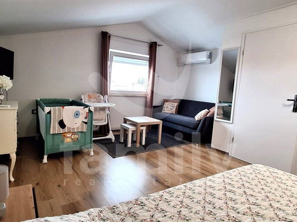 This spacious, two-story apartment of 90 m2 is located in Vodnjan, not far from the center, and in a great location. The apartment is located on the second floor of a small family building with a total of 4 apartments and inside it is an open space consisting of a living room, a high-quality kitchen, a dining area with access to the terrace, which offers a beautiful view of the Brijuni Islands and the sea, a bathroom and a bedroom. Oak stairs lead to the gallery where there is another bedroom and a bathroom. There is a standing height along the entire gallery. The heating and cooling system is via three air conditioning units (each bedroom with its own air conditioning and one unit is located in the living room). During the furnishing of the property, attention was paid to every detail, including a chandelier in the living room with a Bluetooth speaker and adjustment of different light colors, PVC double-glazed windows with 7 gas chambers with ALU shutters and additional insulation. The building is built to a high standard and has an 8 cm thermal facade, while the stairs in the hallway of the building are covered with Dalmatian stone. The property is close to all supporting facilities such as shops, restaurants, cafes, pharmacies, schools, kindergartens, post offices, veterinary services, etc. The apartment has two parking spaces and a storage room/shed in the house's yard.