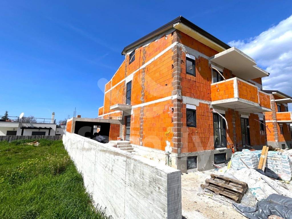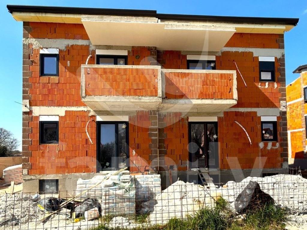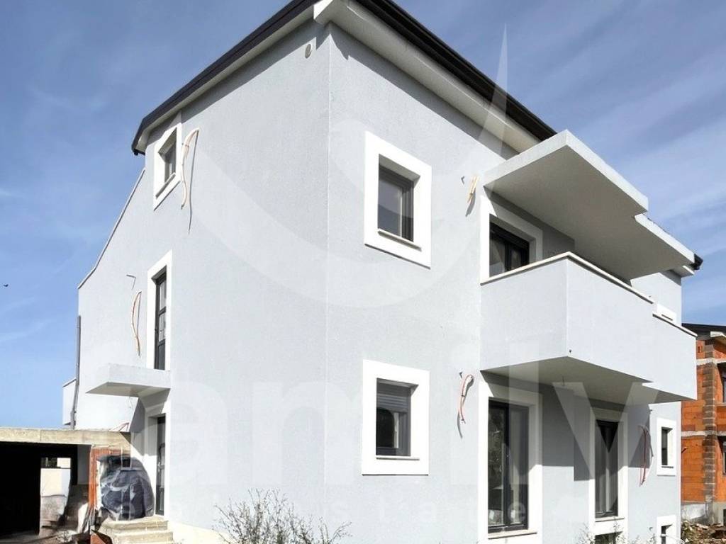 Only 350 meters from the center of Peroj and 650 meters from the sea is this spacious semi-detached house with a wonderful view of the sea. The house is spread over four floors and consists of a basement, upper ground floor, first floor and attic with a total gross area of 358 m2. One of the advantages of this building is certainly the large terraces that have a wonderful view of the sea on the west side. Every room, with the exception of the basement, has access to a private terrace with a view of the sea or greenery. In the courtyard of the house on the west side there is a swimming pool with a total area of 25 m2. The building has two parking spaces, one in the garage and one open parking space. The house is sold in the roh-bau phase with installed gray PVC carpentry and installed installation of the first phase of water and electricity, as well as plastered walls. For heating and cooling in each room, the first stage for the air conditioning units was laid and a chimney was prepared for the possible installation of a stove. An installation for solar panels on the roof has also been saved.