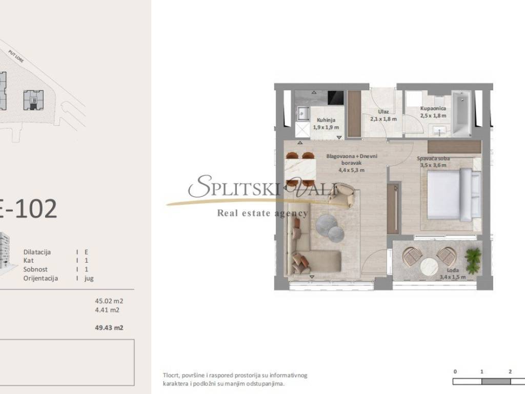 Stan E102 - jednosoban stan ukupne površine 49,43 m2, nalazi se na prvom katu od ukupno 10 katova. Stan je južne orijentacije i sastoji se od spavaće sobe, kupatila, kuhinje, dnevnog boravka s blagovaonicom i lođe. Velike staklene stijenke u stanu pružaju mnogo osvjetljenja tokom dana i predivan pogled iz samog stana. Stanu pripada i parking mjesto u garaži u iznosu od 35 000 po svakom mjesta i sprema koja se nalazi u suterenu zgrade u iznosu od 22 000. Razgled nekretnine moguć je isključivo uz potpisani Ugovor o posredovanju, a što je u skladu sa Zakonom o zaštiti podataka i Zakonom o posredovanju i prometu nekretninama. Kupac plaća posredničku naknadu od 2%+pdv. Za više informacija obratite se na 099 1600 416 Dino.