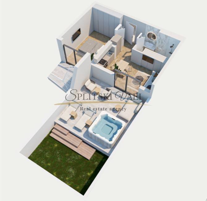 Sastoji se od hodnika, dnevnog prostora s kuhinjom i blagovaonicom, kupaonice, spavaće sobe te vrta i terase s jacuzzijem uključenim u cijenu.