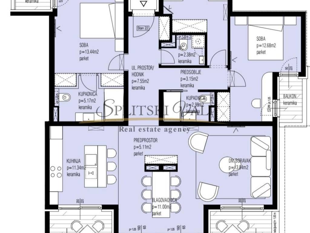 Stan S22, smješten na 3.katu, sastoji se od ulaznog prostora, predprostora, tri spavaće sobe, kuhinje, blagovaonice, dnevnog boravka, predsoblja, 2 kupaonice, wc-a i balkona s prekrasnim pogledom na more.