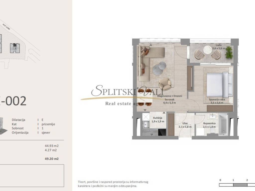 Stan E002 - jednosoban stan ukupne površine 49,20 m2, nalazi se u prizemlju zgrade od ukupno 10 katova ( glavni neboder ). Stan je sjeverne orijentacije i sastoji se od spavaće sobe, kupatila, kuhinje, dnevnog boravka s blagovaonicom i loggie. Velike staklene stijenke u stanu pružaju mnogo osvjetljenja tokom dana. Stanu pripada parking mjesto u garaži u iznosu od 35.000 i sprema koja se nalazi u suterenu u iznosu od 22 000.