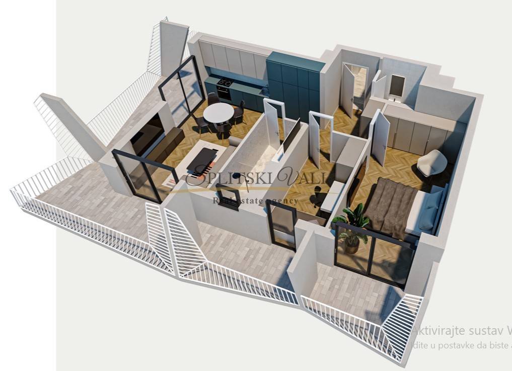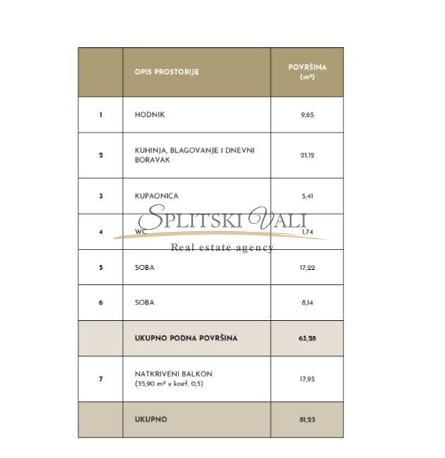 Sastoji se od hodnika, dnevnog prostora s kuhinjom i blagovaonicom, kupaonice, WC-a, dvije spavaće sobe te natkrivenog balkona veličine čak 36m2.