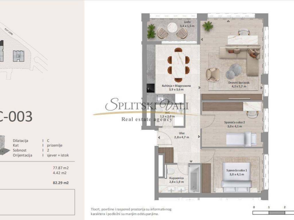 Stan C203- Dvosoban prostran stan, ukupne površine 82.29m2 smješten u prizemlju zgrade od ukupno 6. katova. Stan se sastoji od dvije spavaće sobe , kupatila, wc-a, kuhinje s blagovaonicom , dnevnog boravka i loggie.
