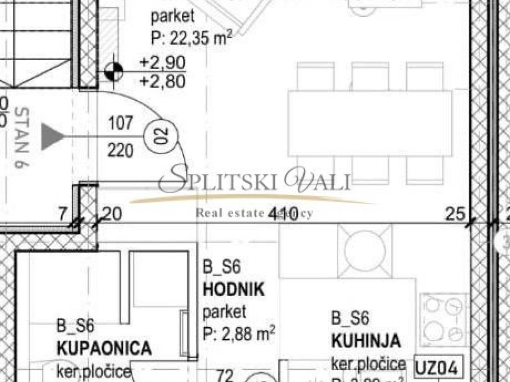 STAN B6 položen na prvom katu stambene zgrade, prostire se na 53,87m2, a sastoji se od kuhinje s blagovaonicom, dnevne sobe, dvije spavaće sobe, kupatila i 5,6 m2 loggie.